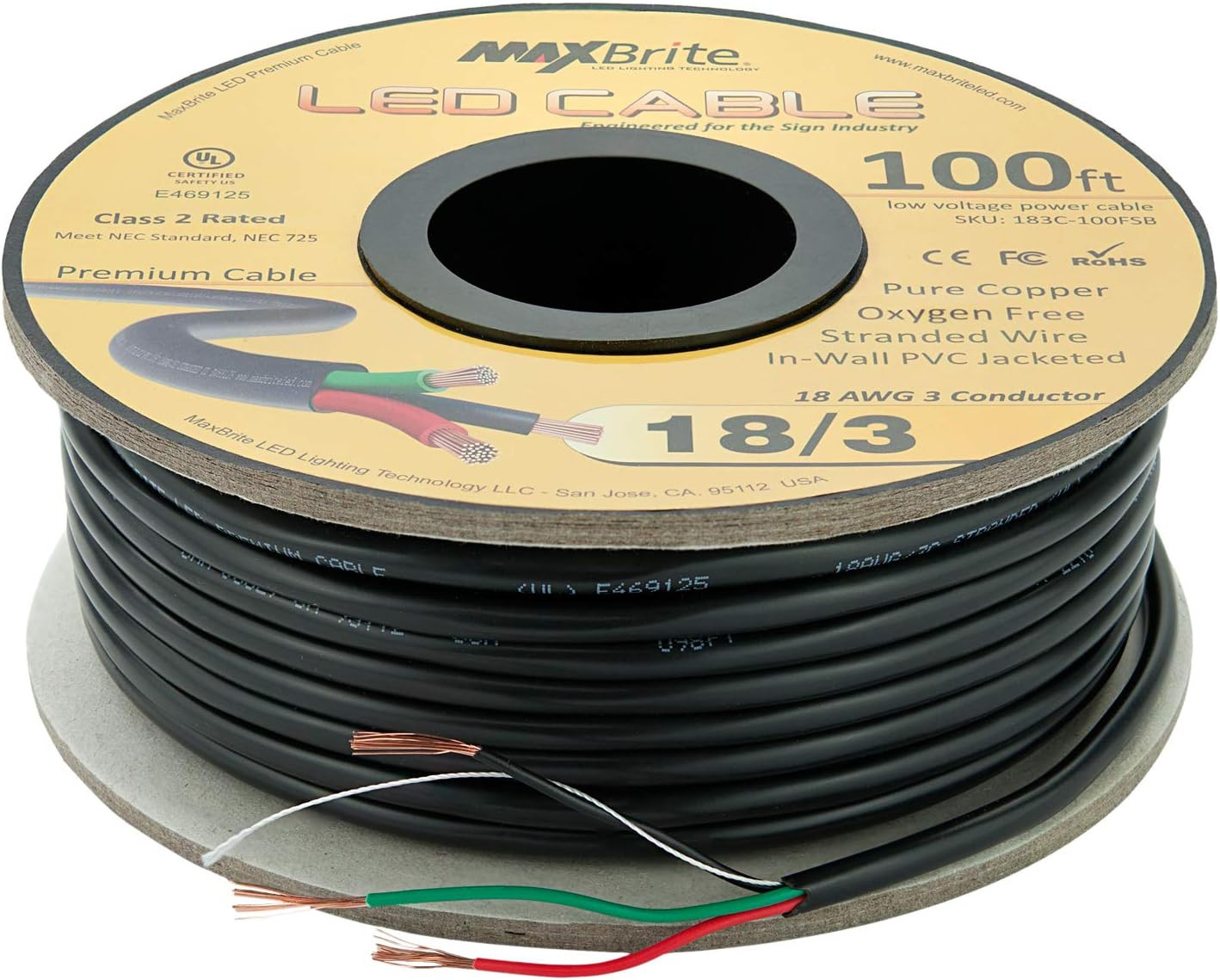 100 Ft. 18AWG Low Voltage LED Cable 3 Conductor Black Sleeve In-Wall Speaker Wir
