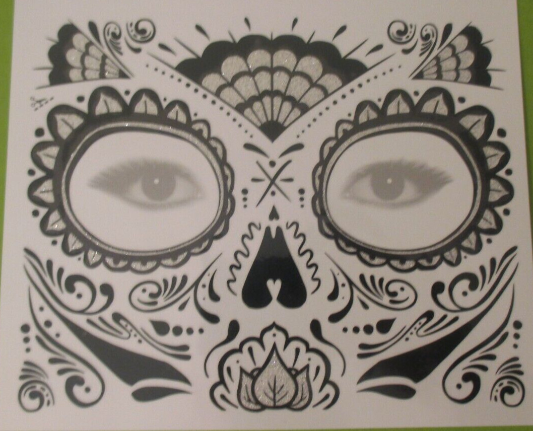 1 Sheet - Halloween FACE Tattoos DAY of the DEAD GRAY GLITTER FAN Sugar SKULL