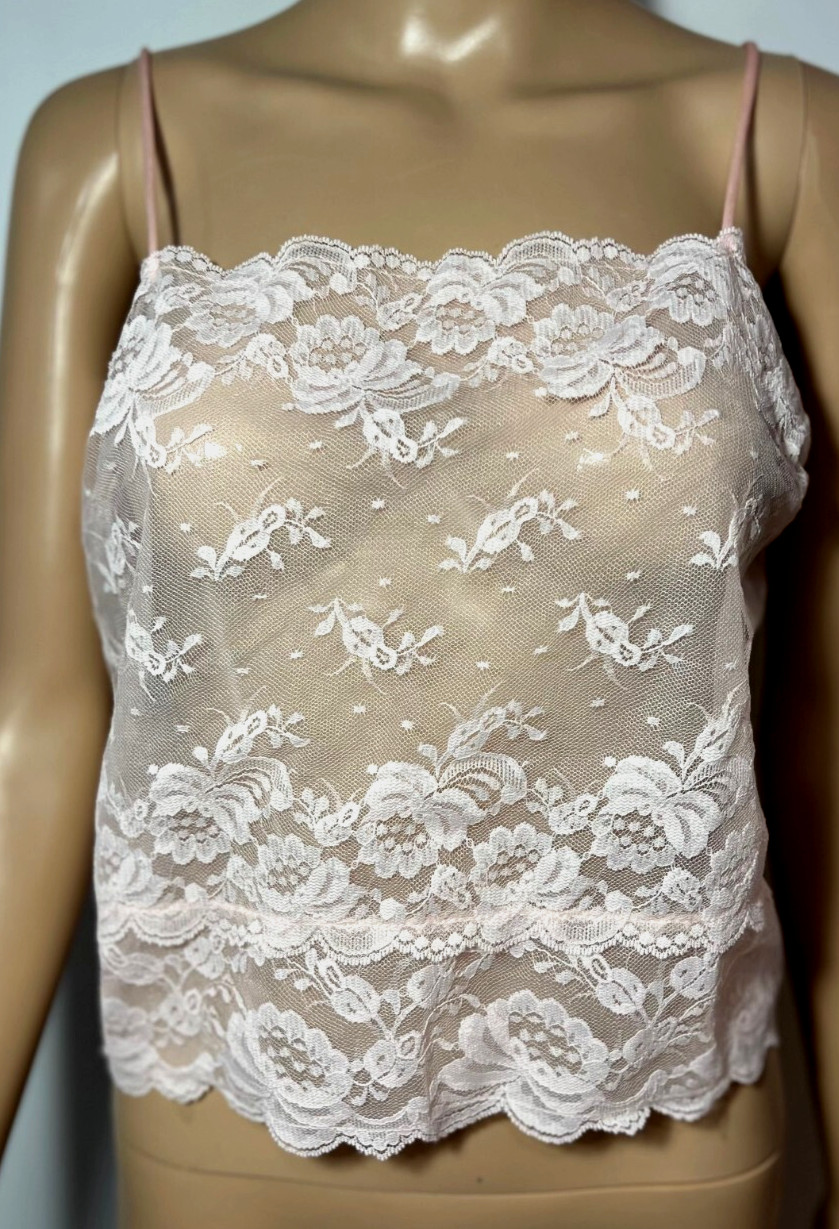 Vintage Crop Cami Tank Top Size Large Camisole by Deena PINK Sheer Nylon LACE