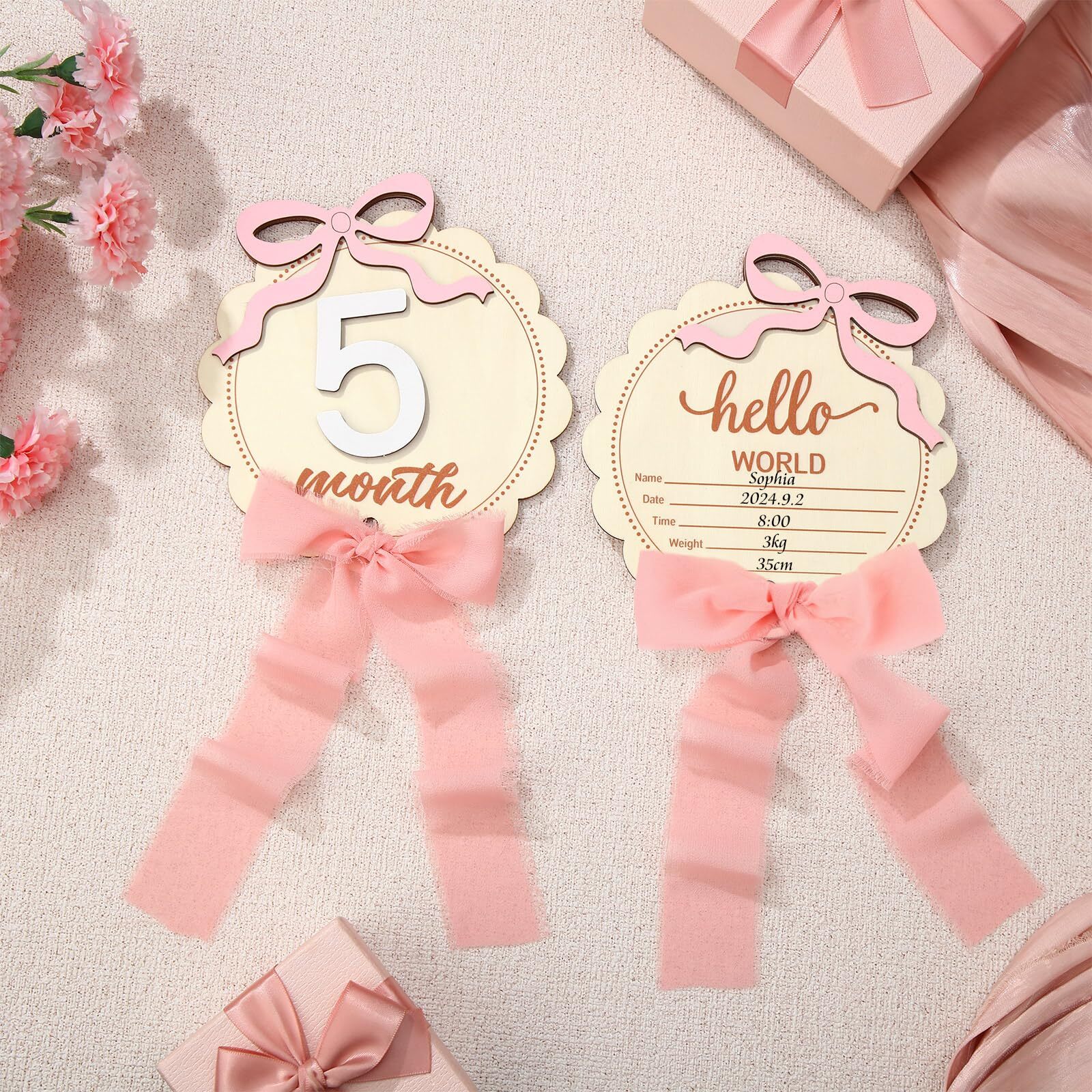 2 pcs Baby Monthly Milestone Cards with Pink Bow Wooden Monthly Milestone Dis...