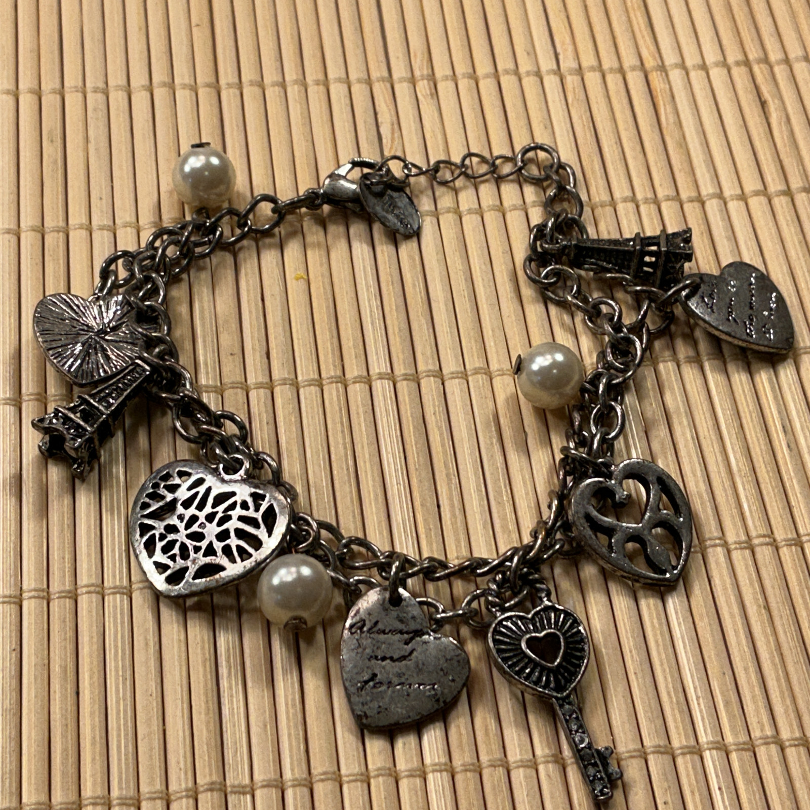 Claire's Bracelet Silver Tone Faux Pearl Heart Message Charm Eiffel TowerLot 45D