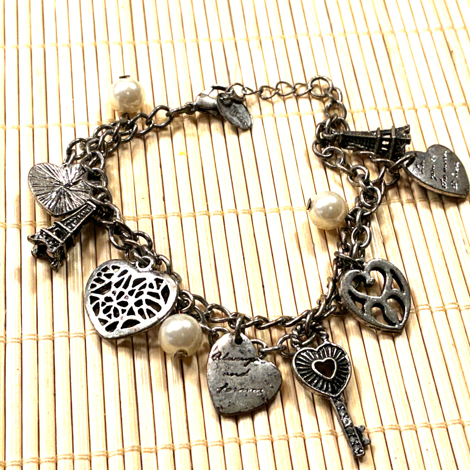 как выглядит Claires Bracelet Silver Tone Faux Pearl Heart Message Charm Eiffel TowerLot 45D фото