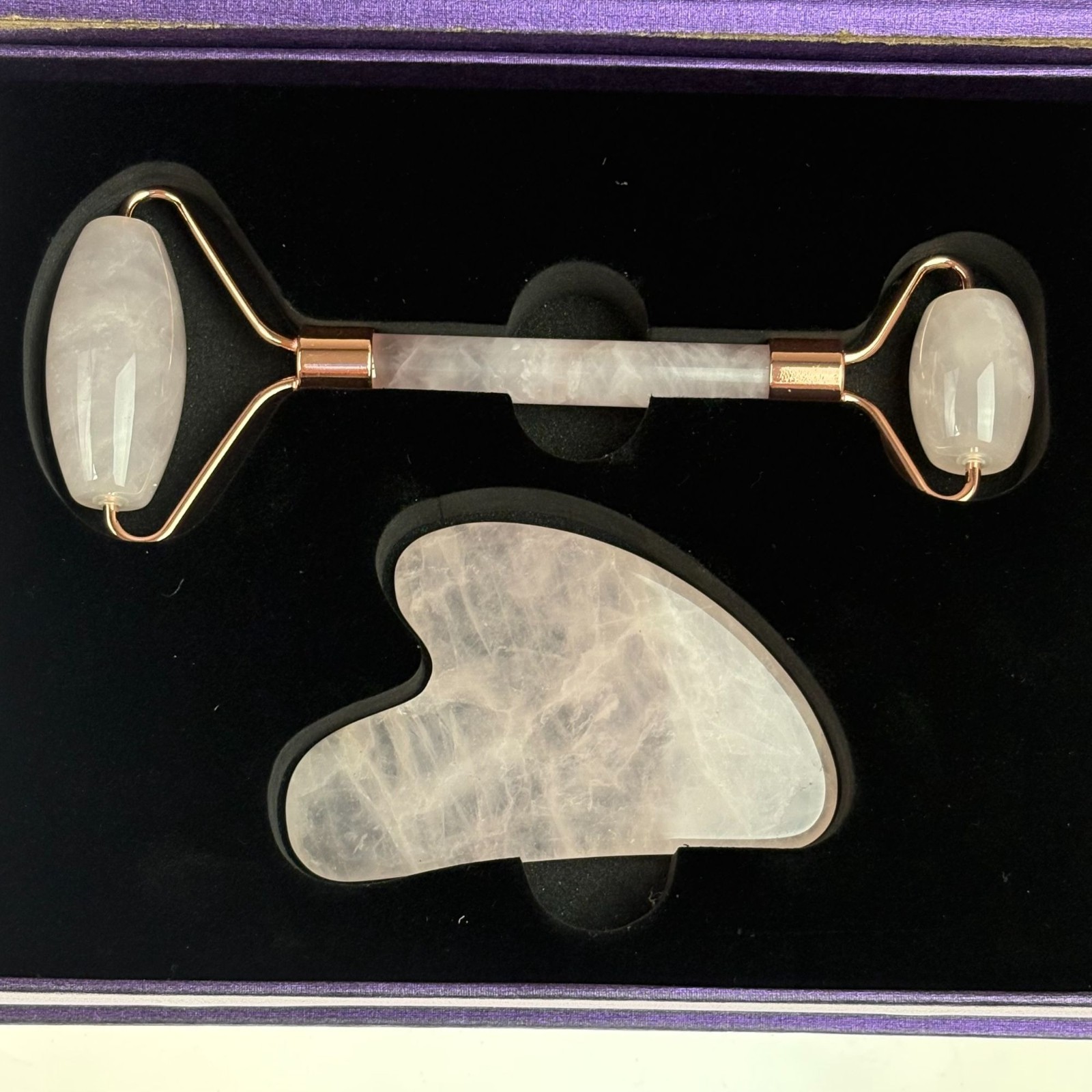 как выглядит Rose Quartz Facial Roller Gua Sha Set In Elegant Purple Box Skin Massage Gift фото