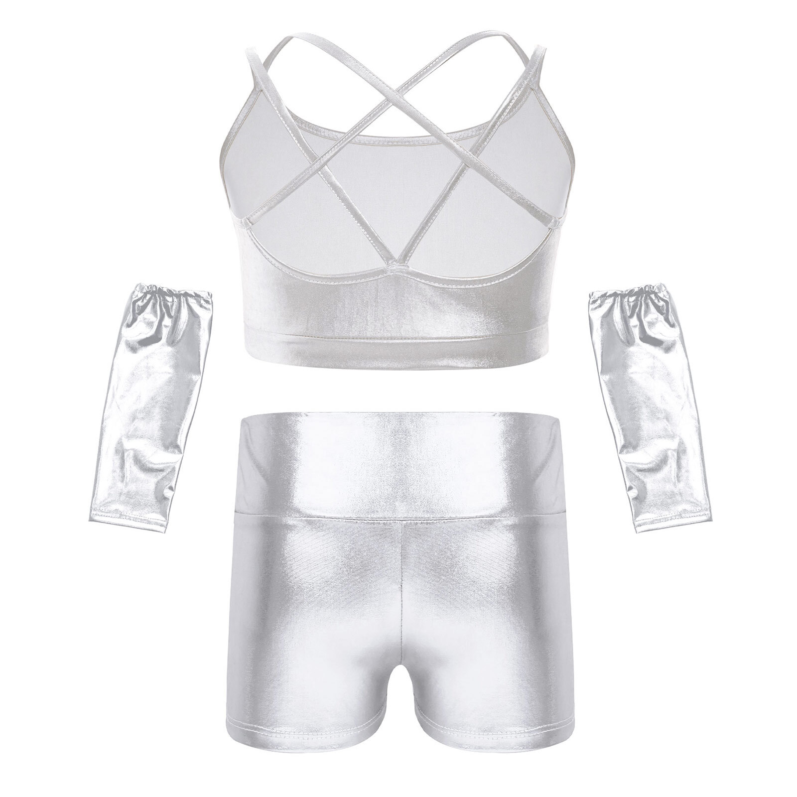Girls Shiny Metallic Dance Outfits Crop Top Shorts Gloves Stage Performance