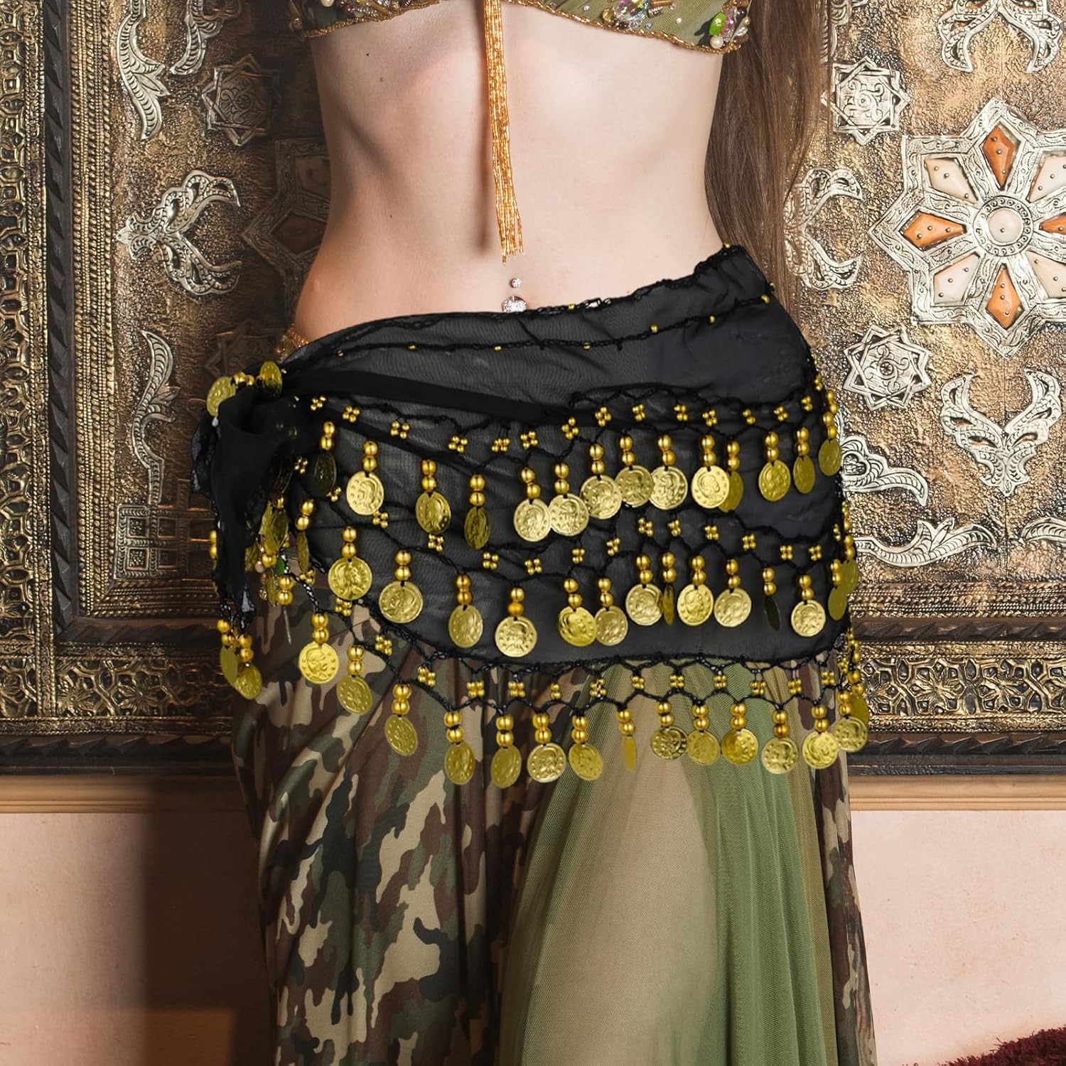 Belly Dance Hip Scarf, Belly Dancer Outfit, 3-Layer Gold Coin Crochet Design,
