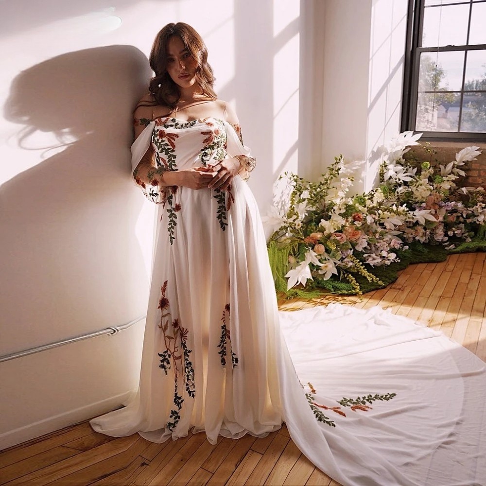 Embroidered Colorful Wedding Dress Off the Shoulder Lace Up Back Chiffon Forest