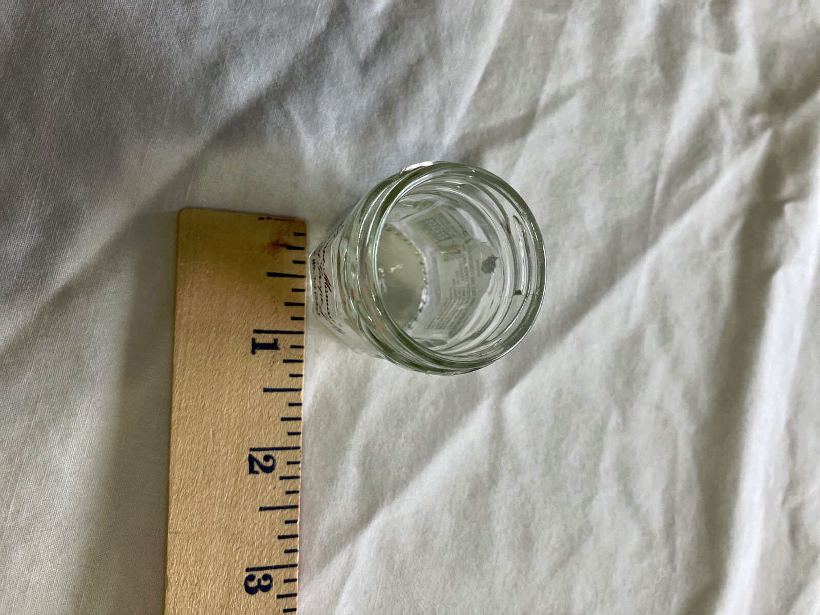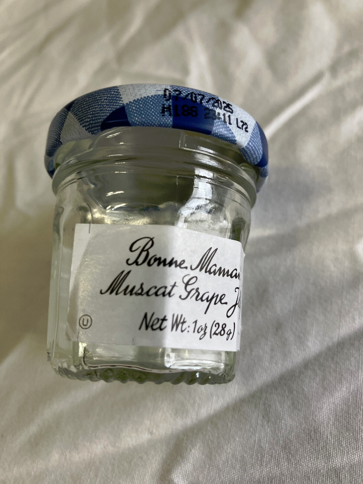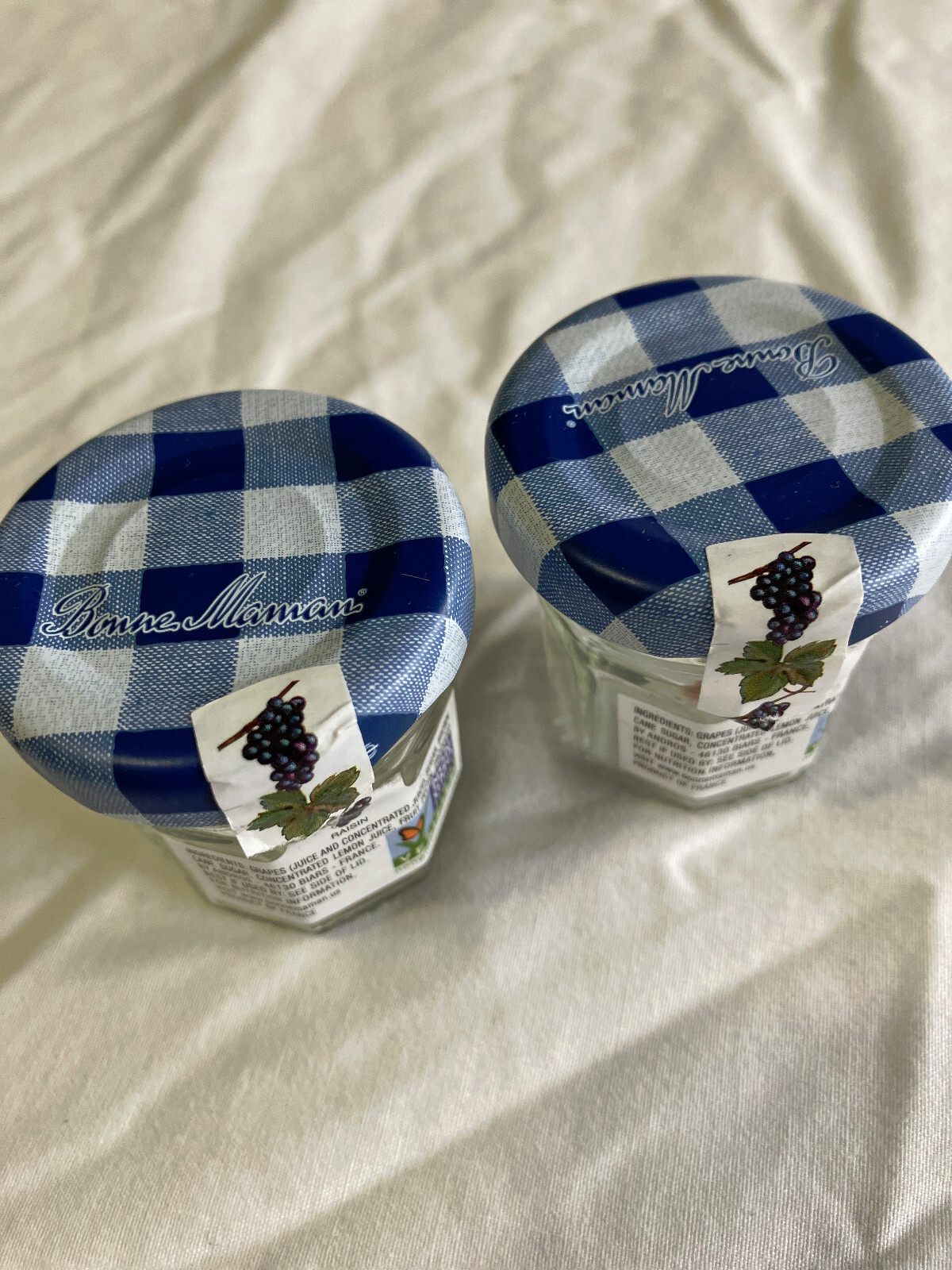 • Empty set of 2 mini Bonne Maman jelly jars blue white lids craft supply storage