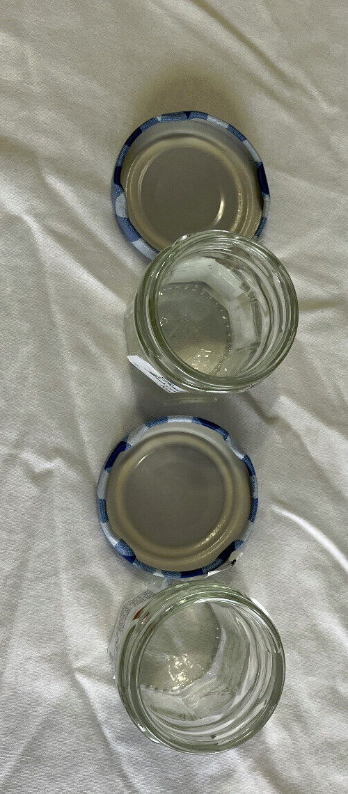 Empty set of 2 mini Bonne Maman jelly jars blue white lids craft supply storage