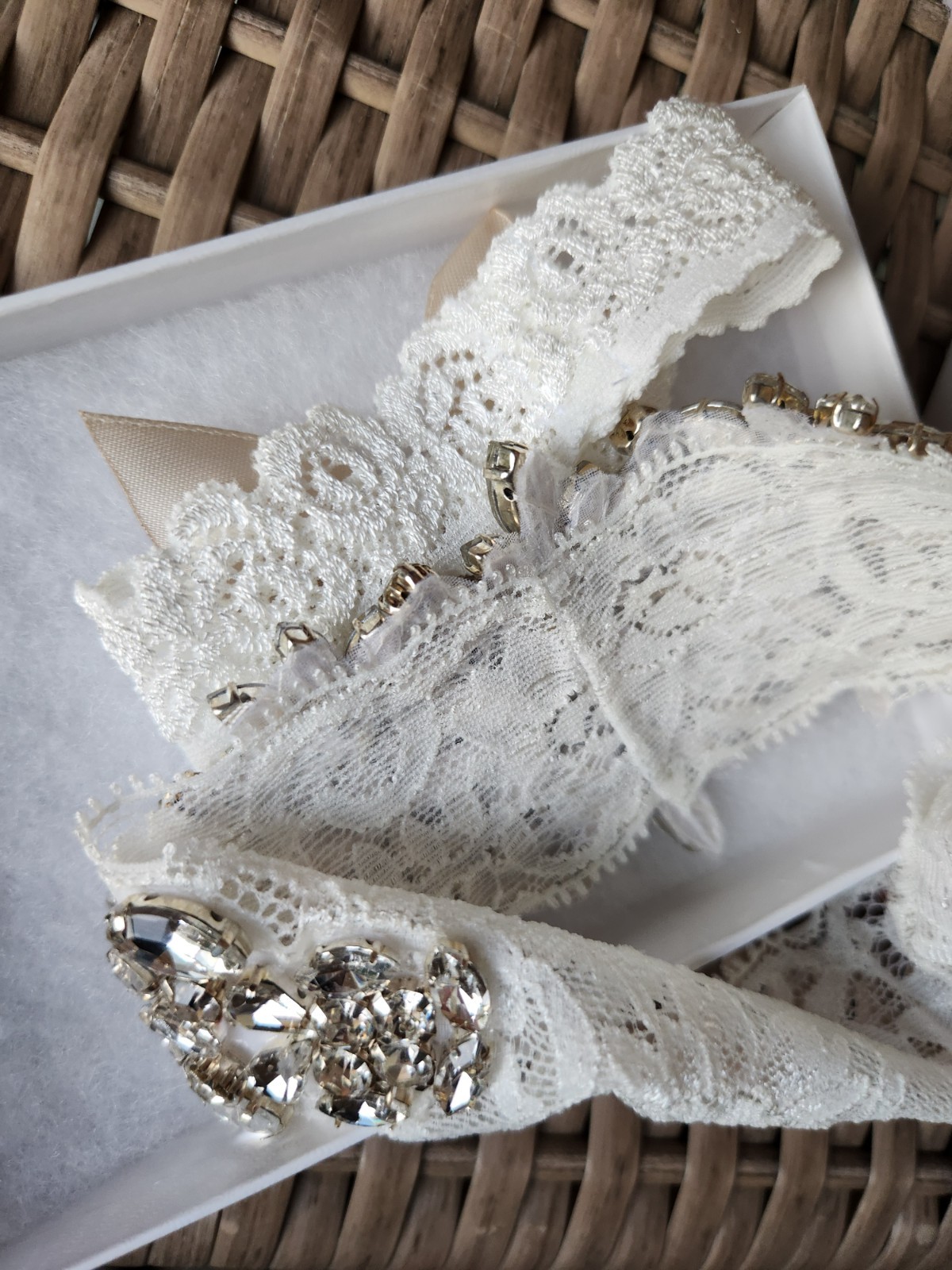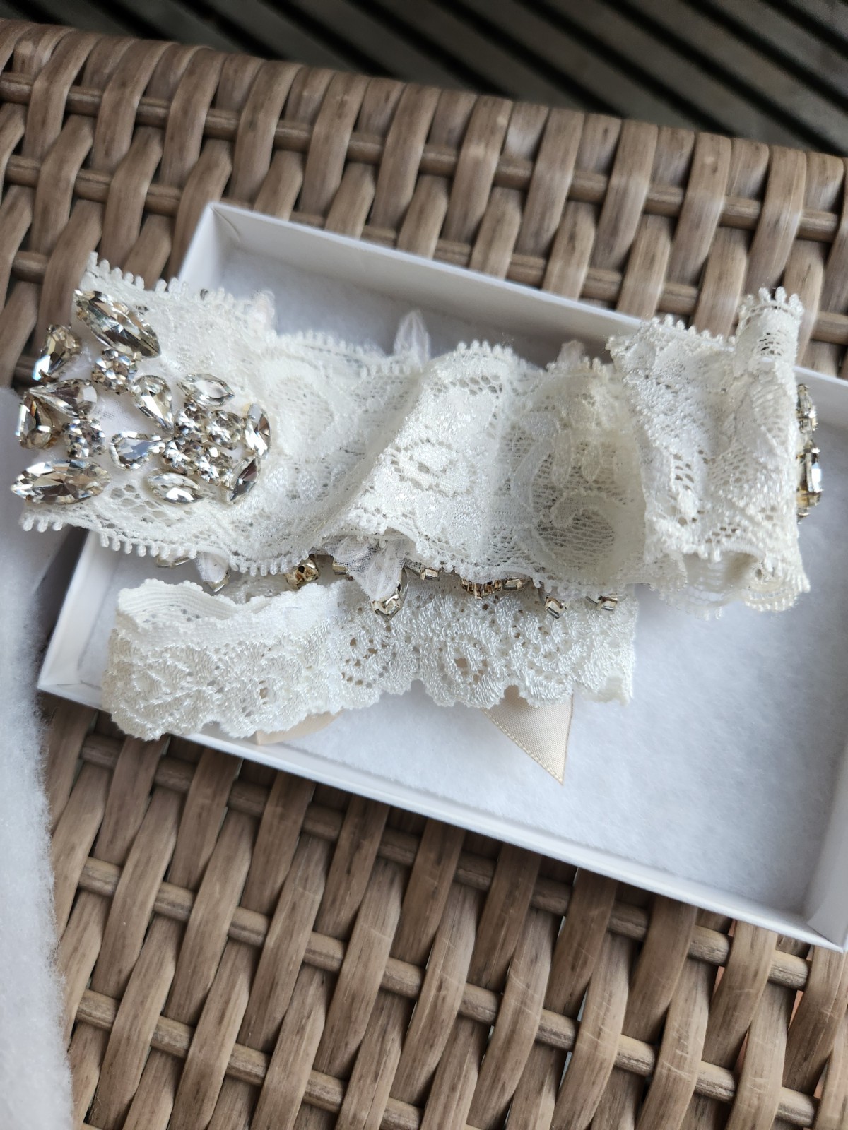 14 inch White Lace Bridal Leg Garter With Rhinestones Applique