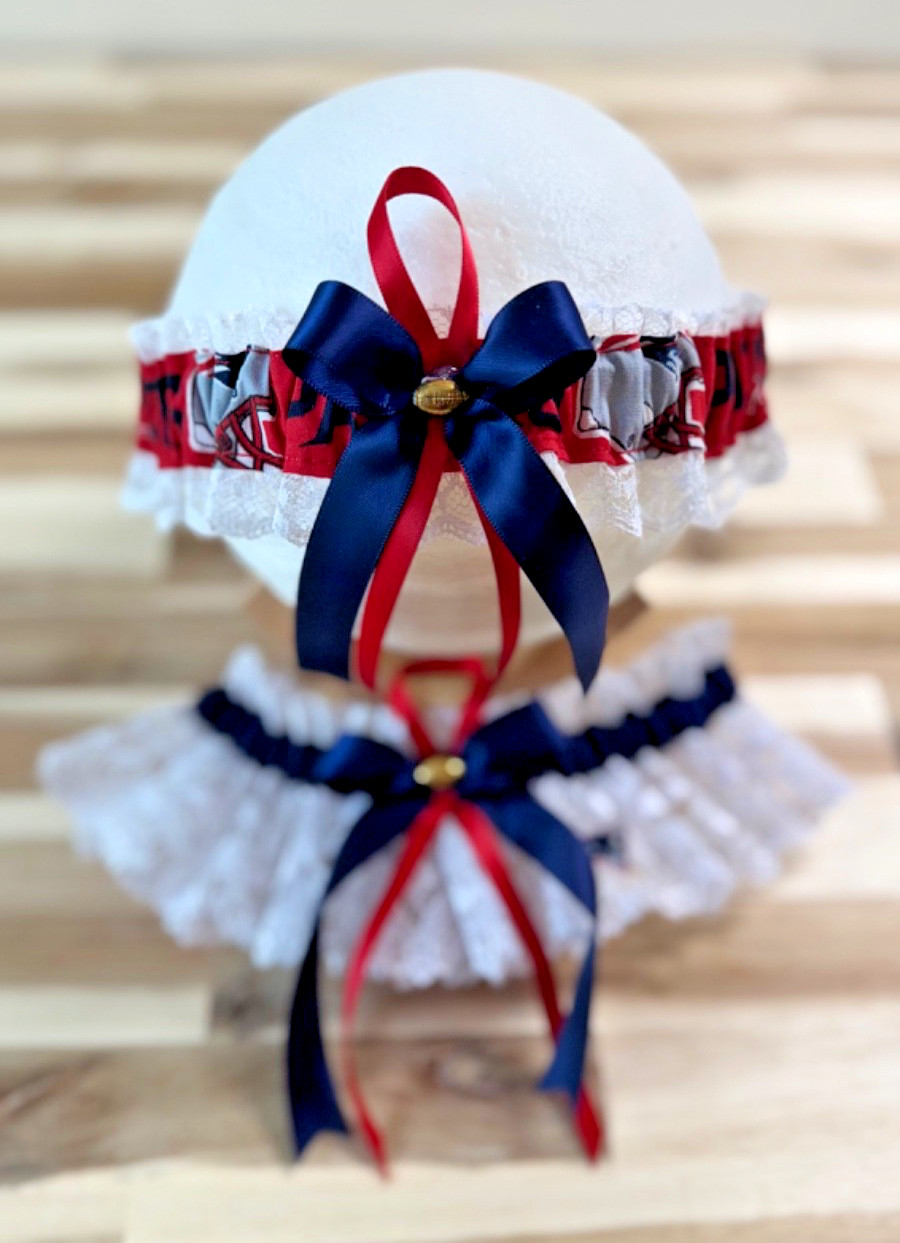 Wedding Garter England Patriots NFL White Lace Navy Blue Satin Ribbon Set.