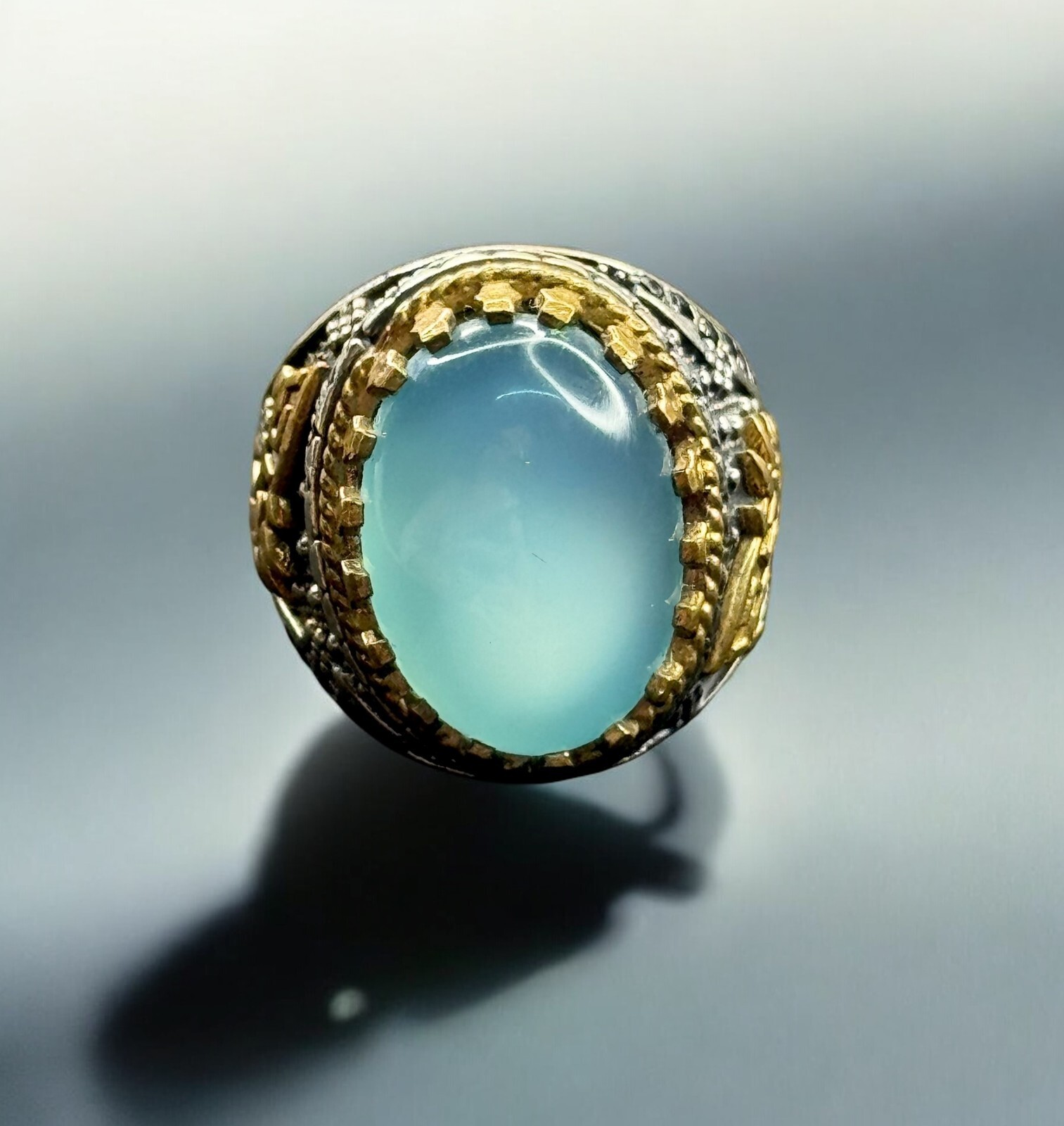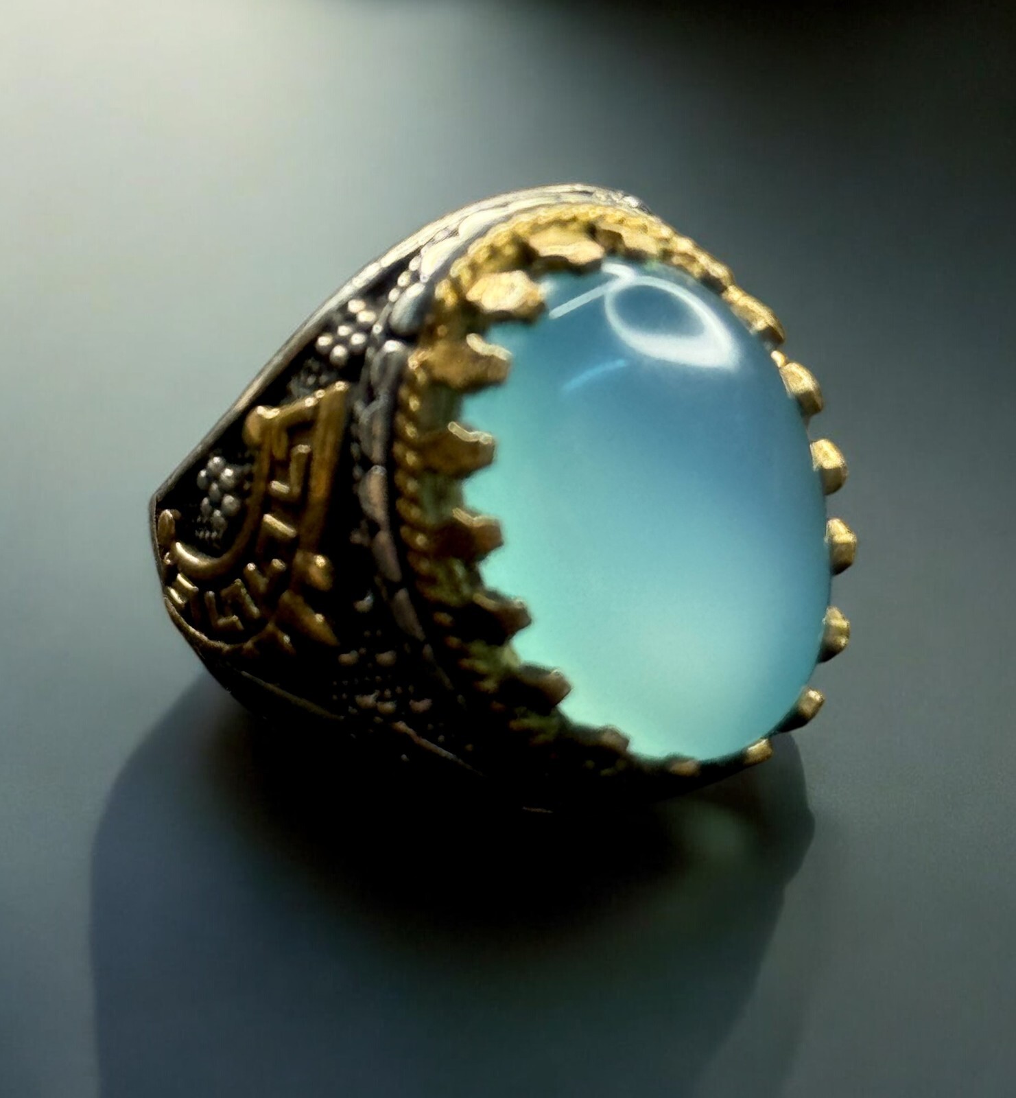 Sterling Silver Handmade Yemen Blue Aqeeq Ring Natural Agate Stone 925