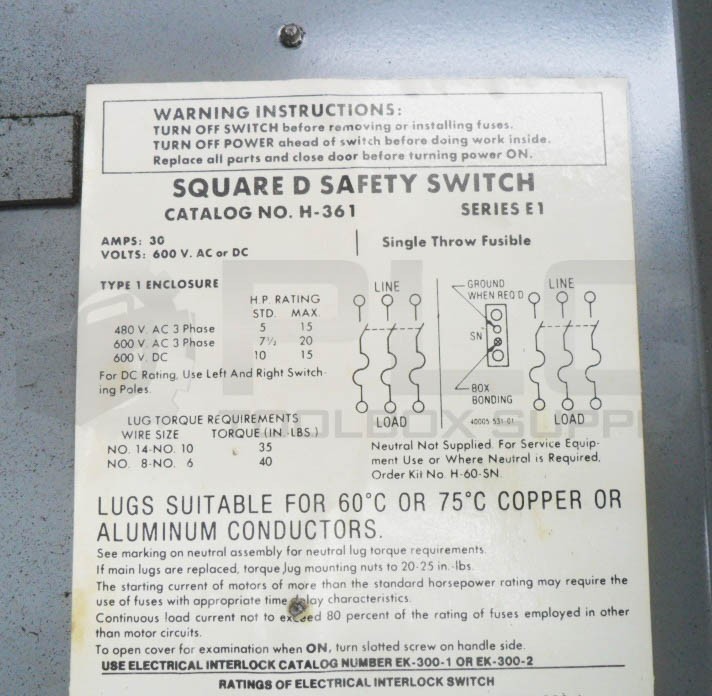 SQUARE D H-361 /E1 SAFETY SWITCH 30A 3PH 600VAC