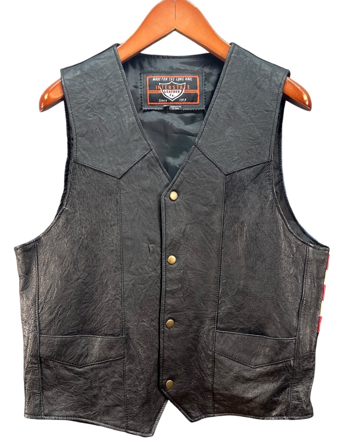 USA American Flag Black Leather Biker Vest Size M Snap Front Pockets Motorcycle