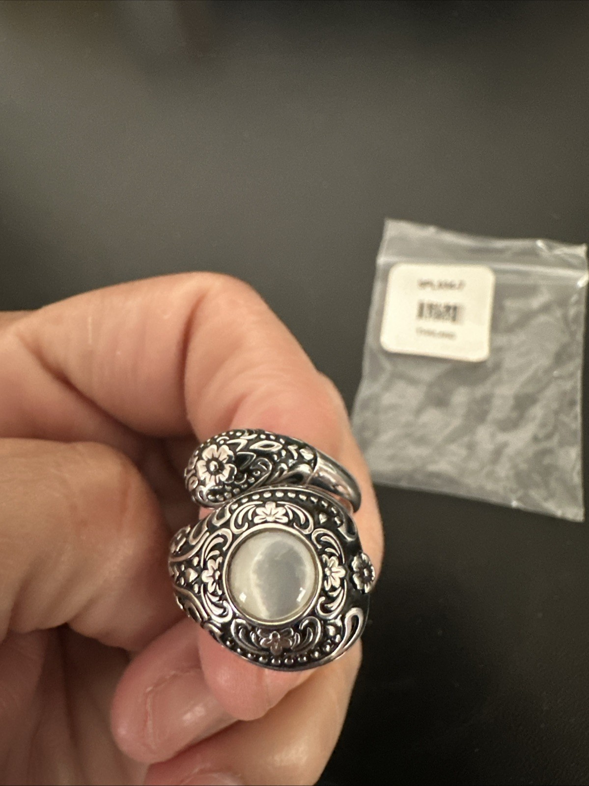 как выглядит 7.5 mm White Mother-of-Pearl Rd Over Sterling Silver Oxidized Bypass Ring SIZE 7 фото