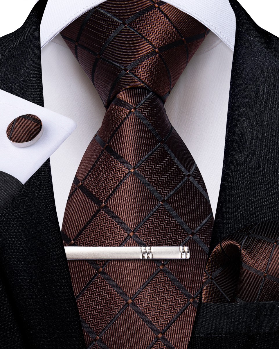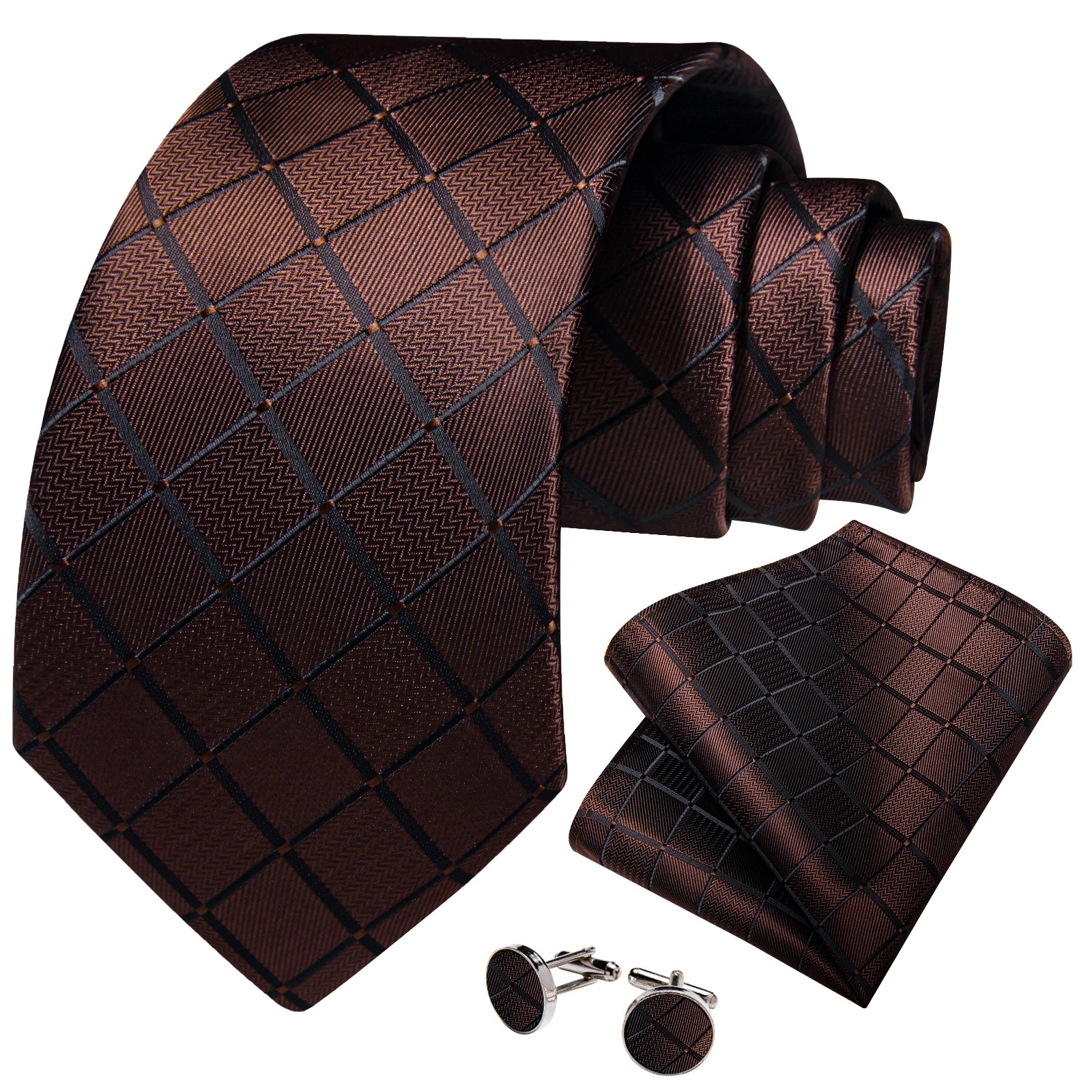 Brown Plaids Checks Necktie Mens Tie Hankie Cufflinks Tie Pin Set Gift
