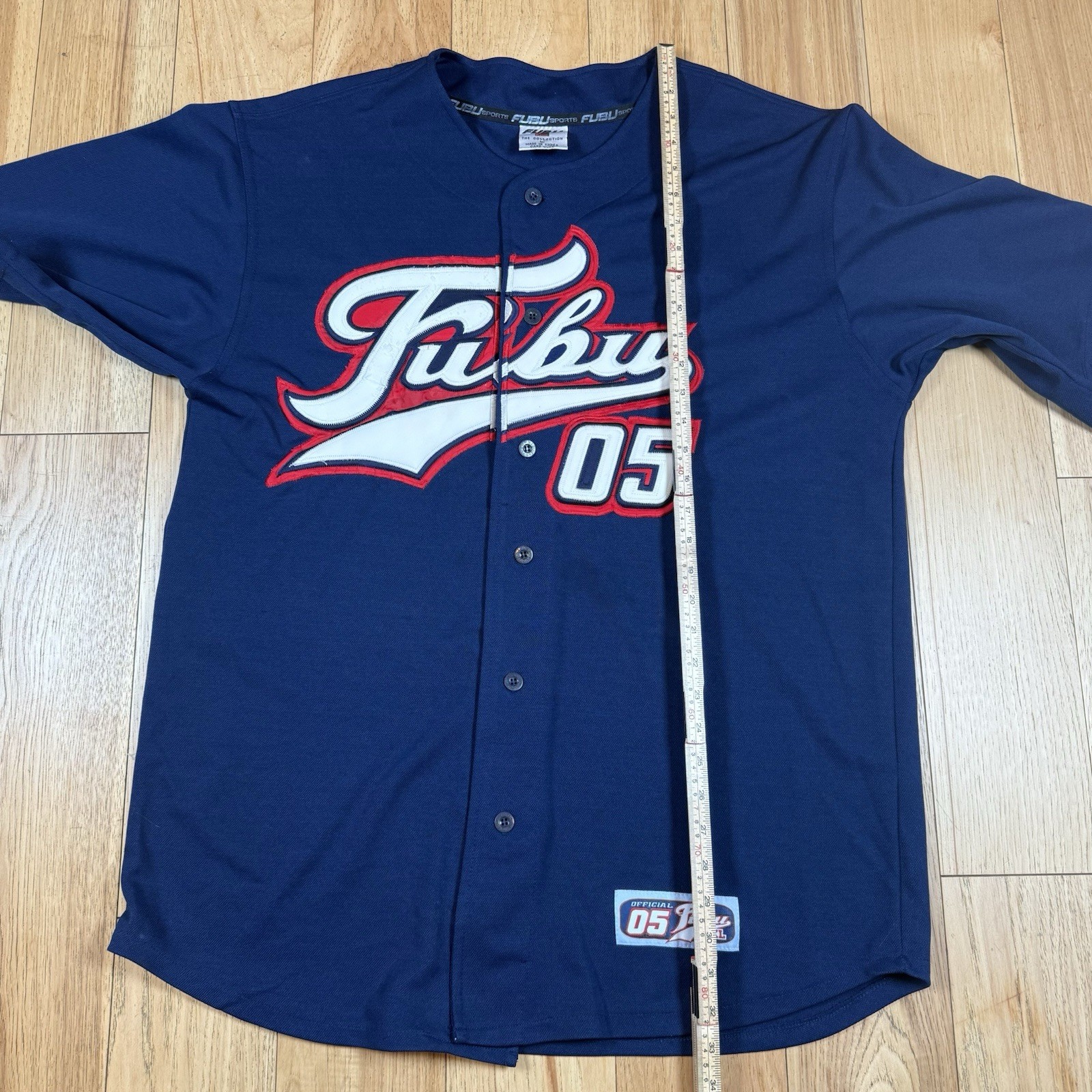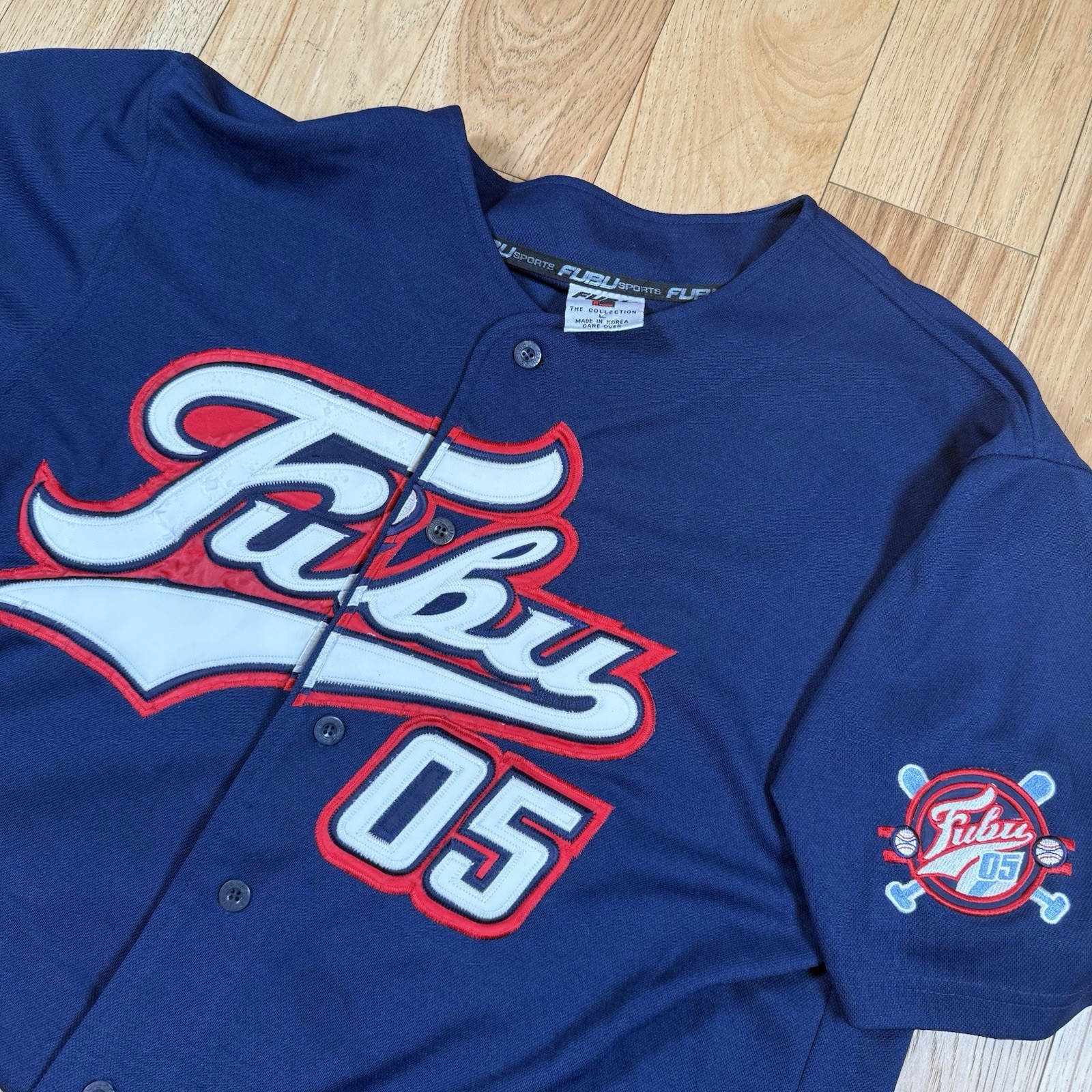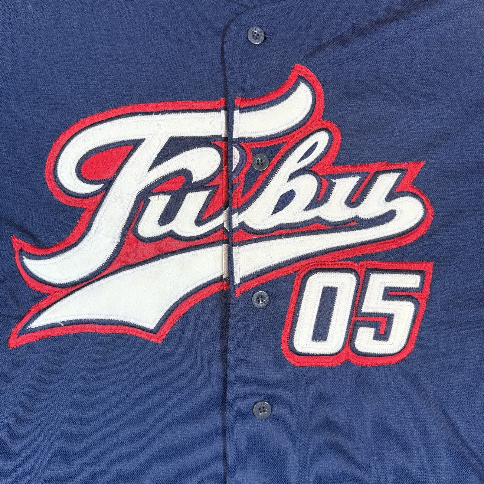 VINTAGE Fubu 05 Sports Collection Baseball Jersey Mens Large Blue Button Y2K