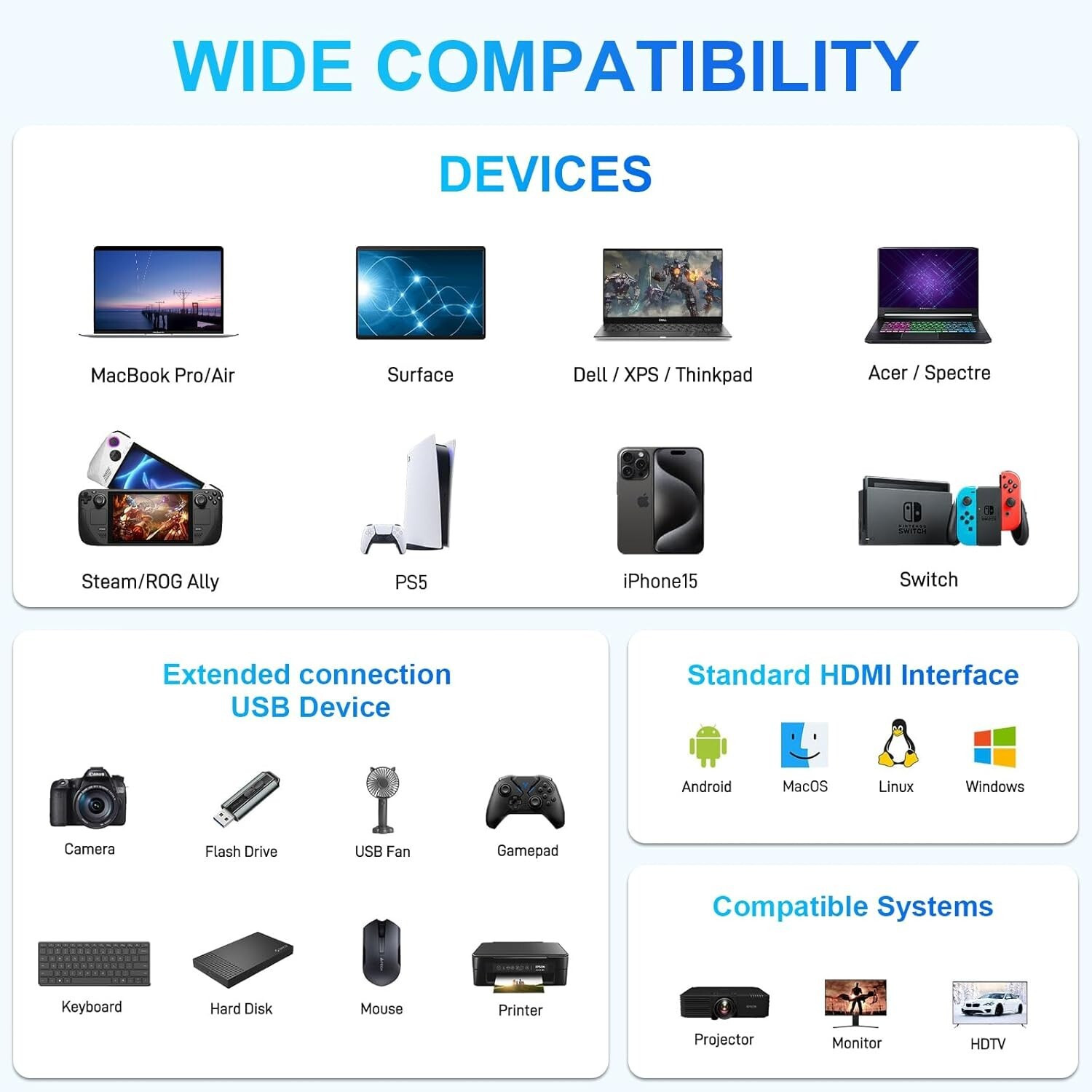 Connector A: HDMI Standard Female, USB, USB-C