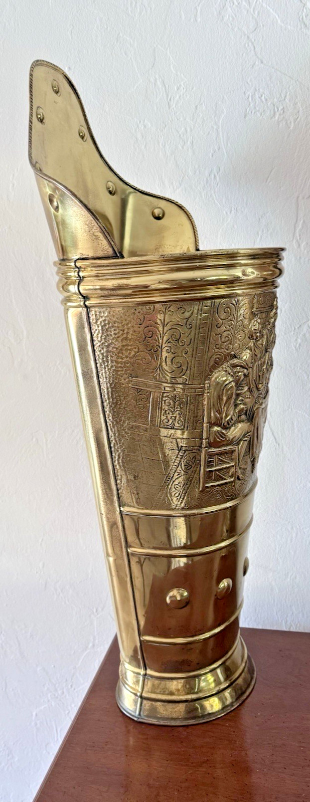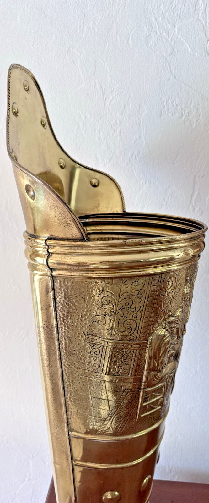 • Antique Umbrella Stand Brass Embossed Relief Colonial Scene 31" Tall