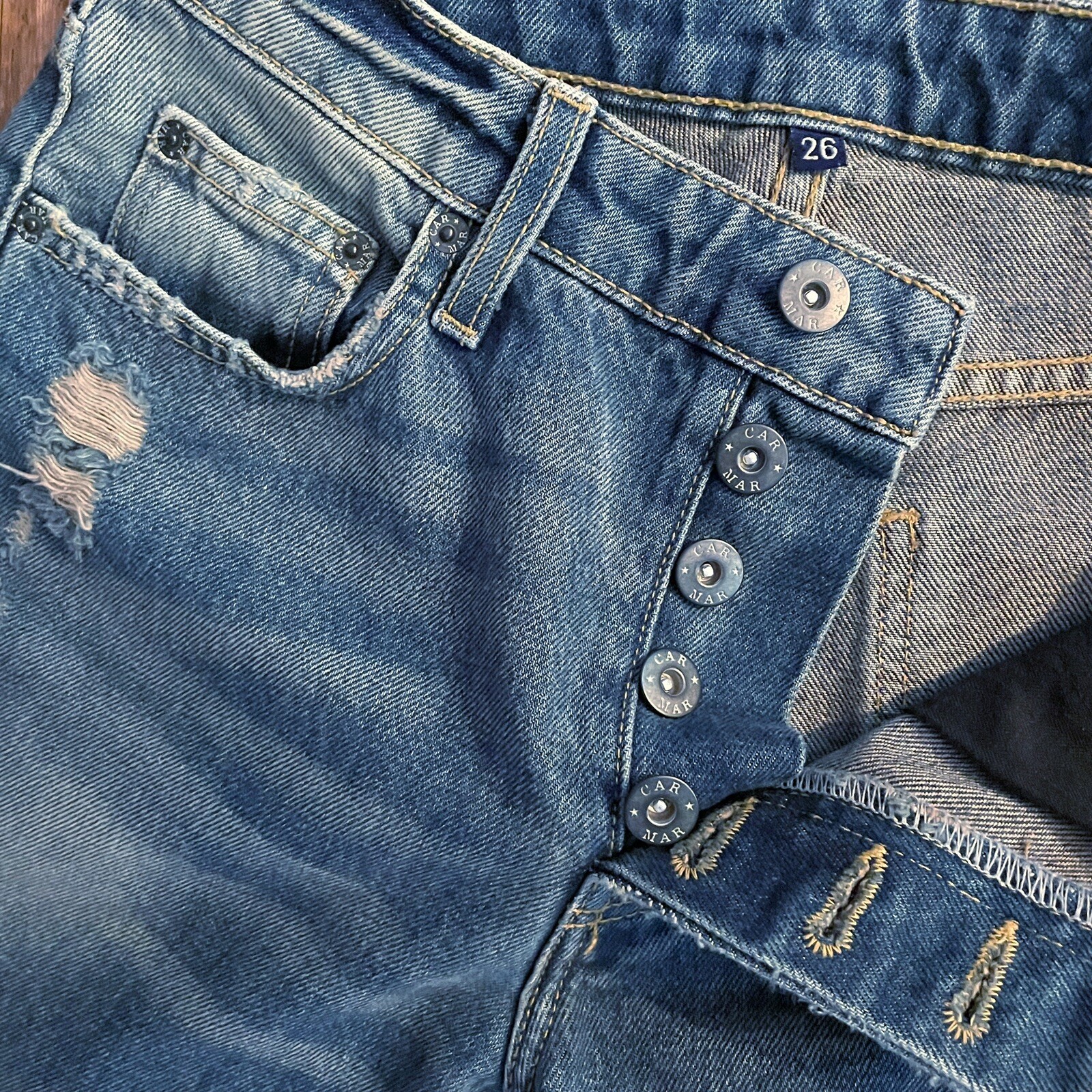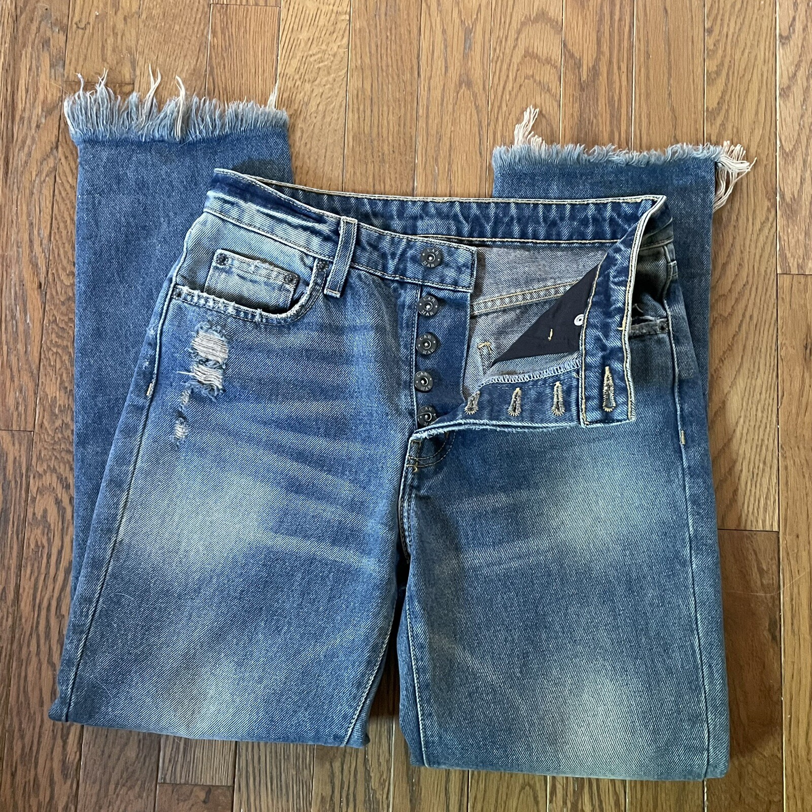 как выглядит Carmar Emilia Jeans Sz 26 Distressed Super Fringed Stepped Hem Button Fly Boho фото