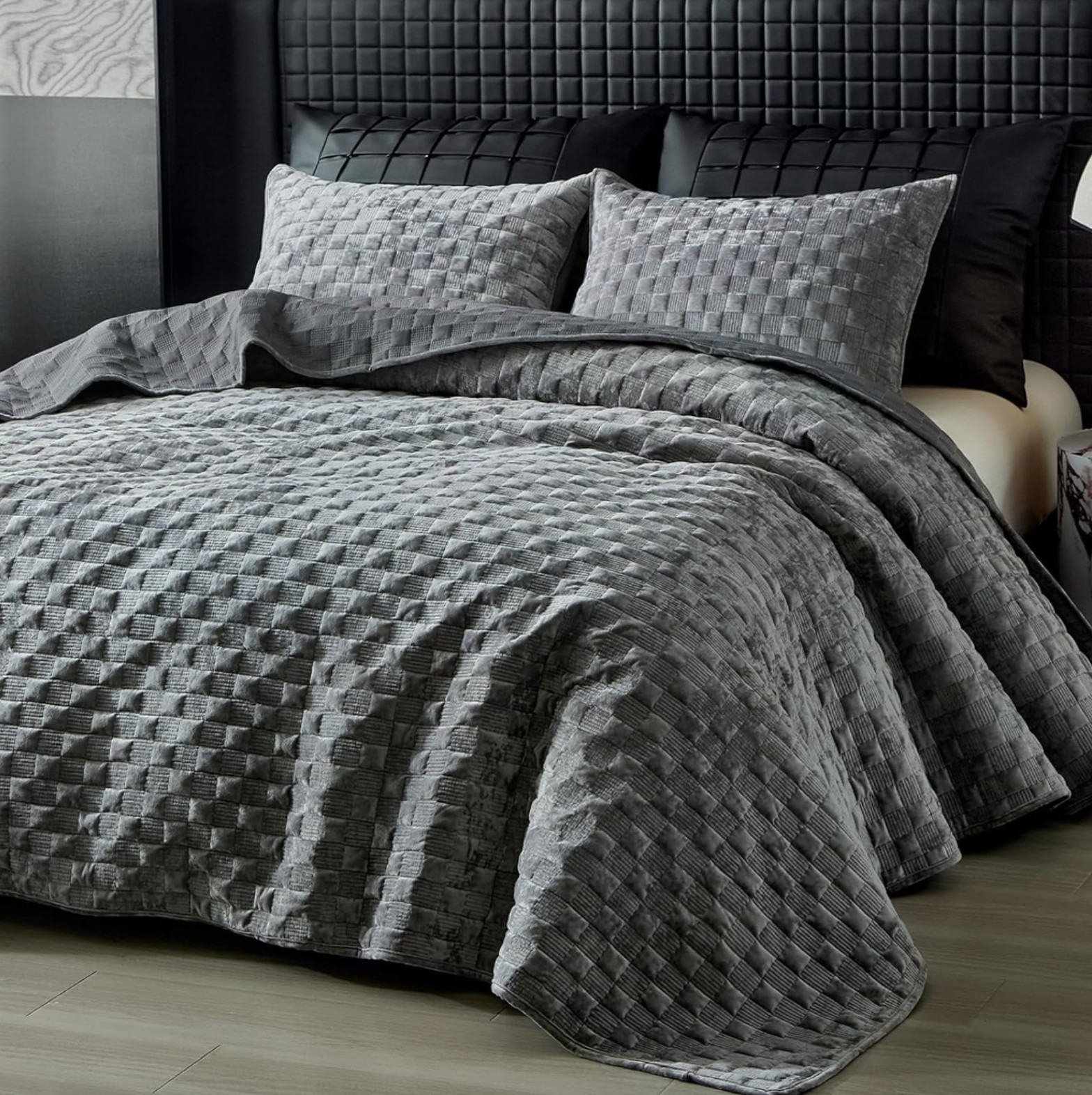 как выглядит Velvet Quilt Set Gray Textured Basketweave Coverlet Luxury Modern Quiet Luxury фото