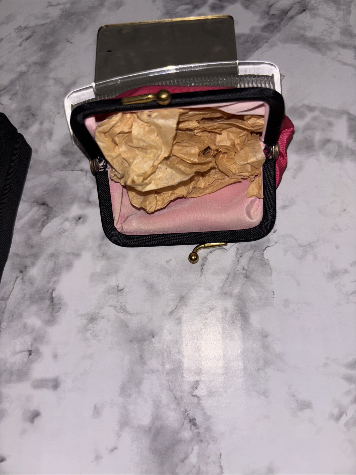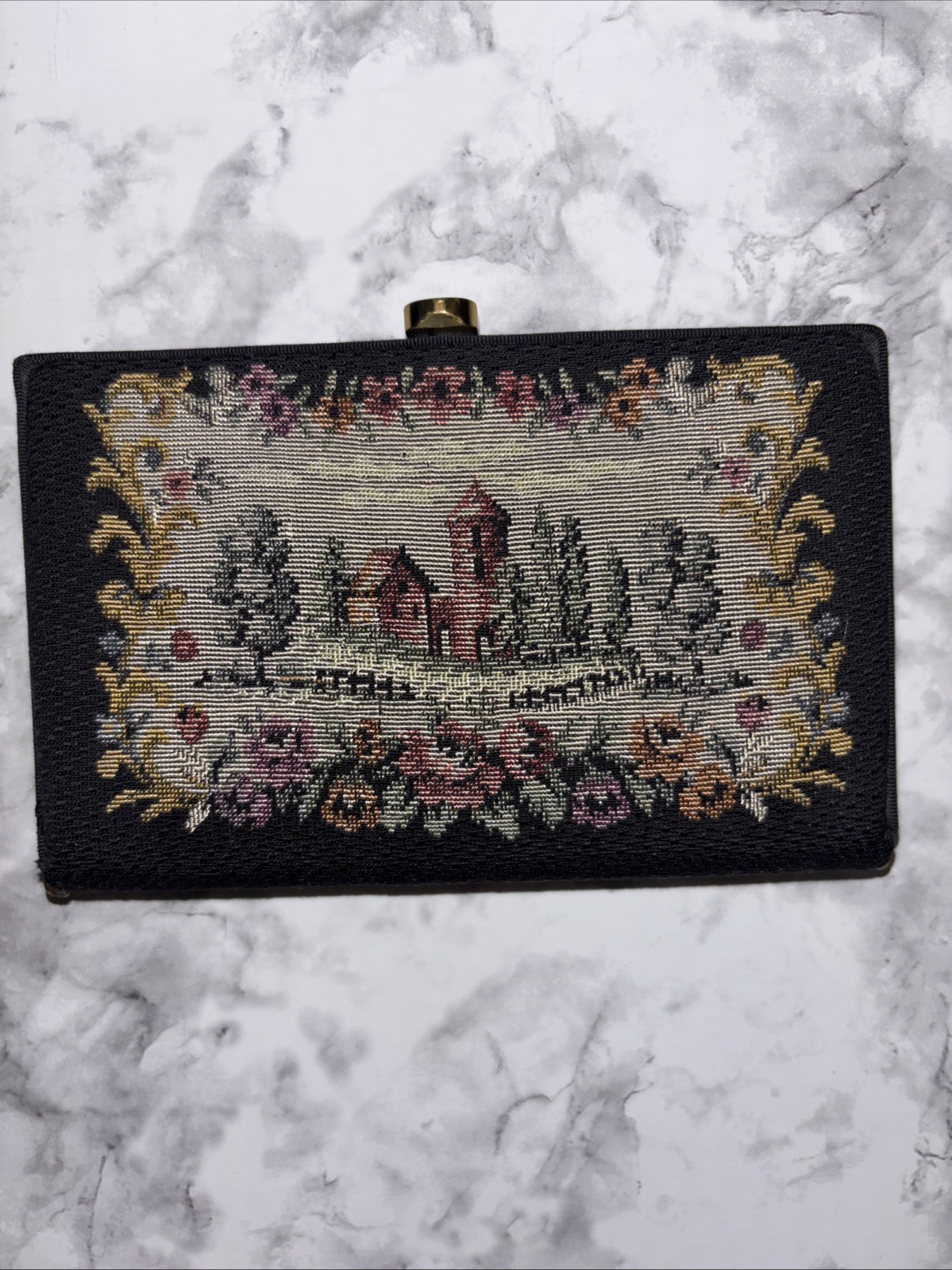 как выглядит Vintage Tapestry Clutch With Comb, Coin, Purse, And Mirror. Floral Boarder Tree фото