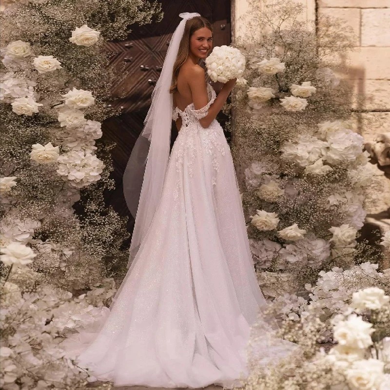 Elegant A-Line Wedding Dresses Off Shoulder Side Slit Lace Applique Bridal Gowns