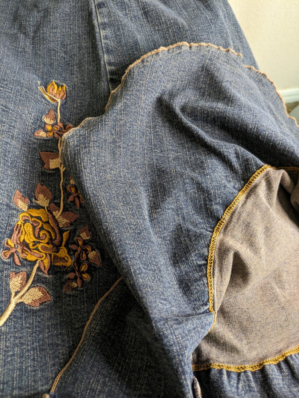 как выглядит VTG Stretch Denim Skirt Floral Embroidery Reverse Ruffle Hem Frayed 37" Waist фото