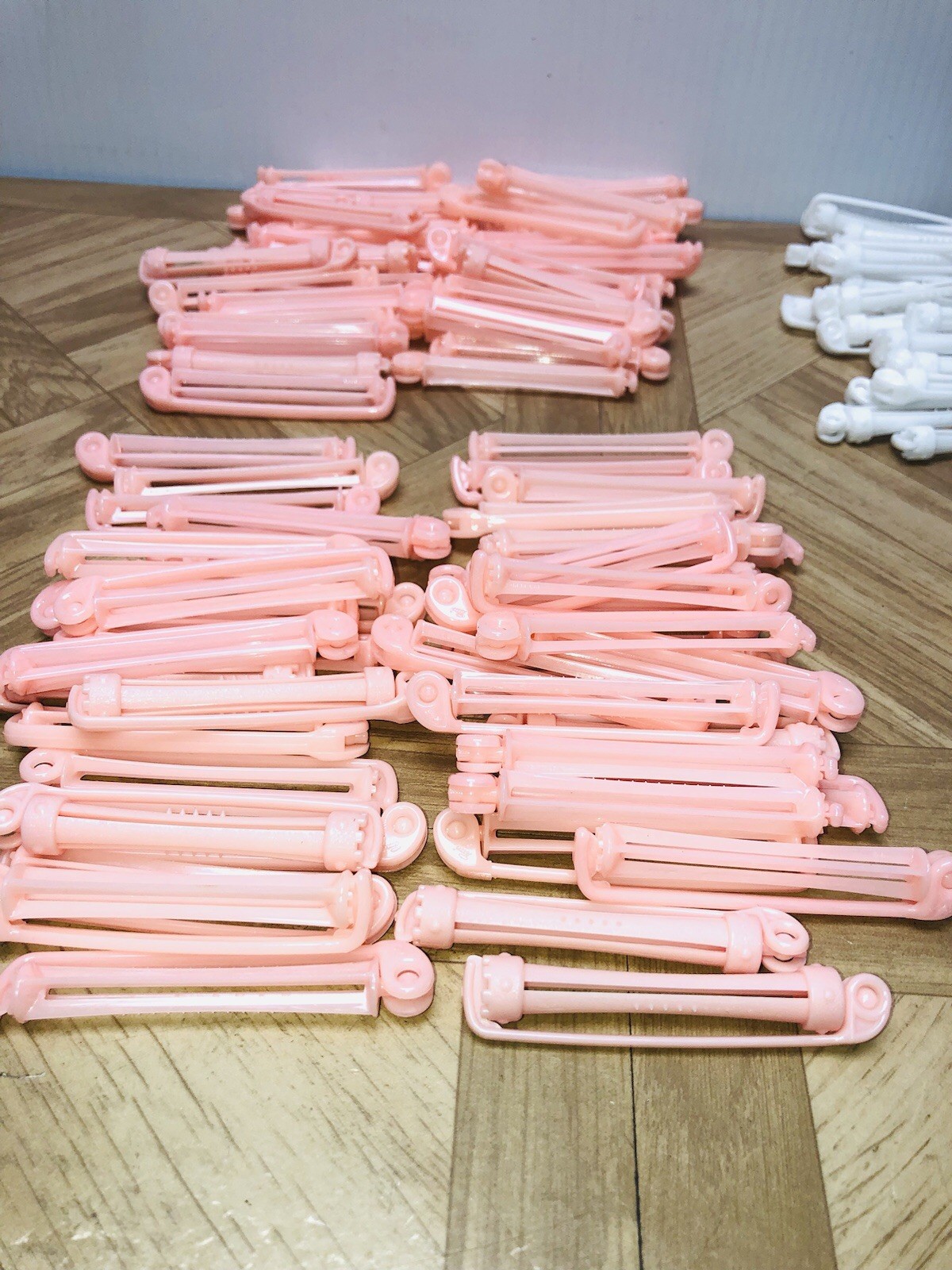 Vintage Lot of 116 Plastic Swing Arm Clip Perm Rods Ass't Sizes Pink White Blue