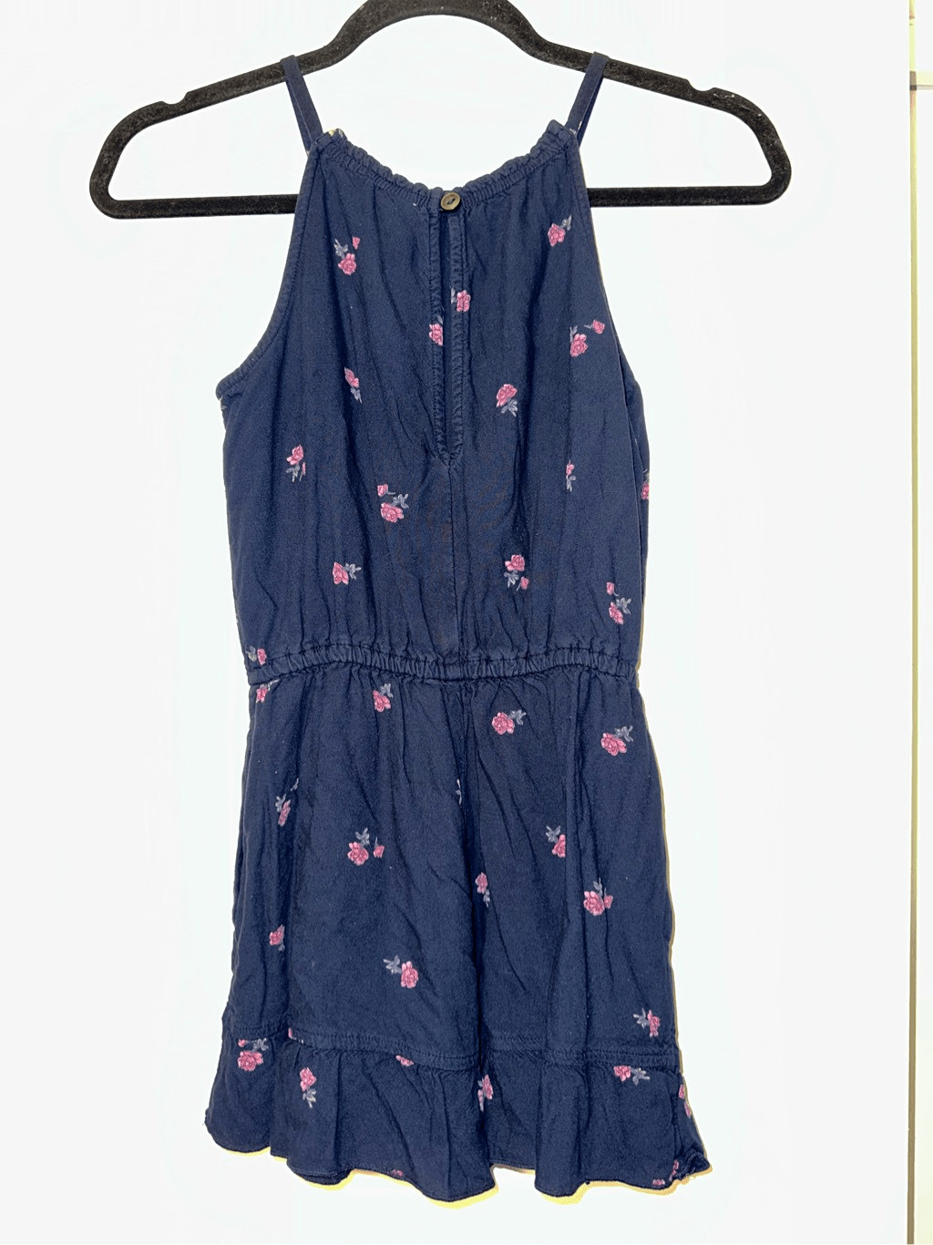 как выглядит Abercrombie Kids 11/12 Navy Blue Pink Floral Ruffle Romper Spaghetti Straps EUC фото