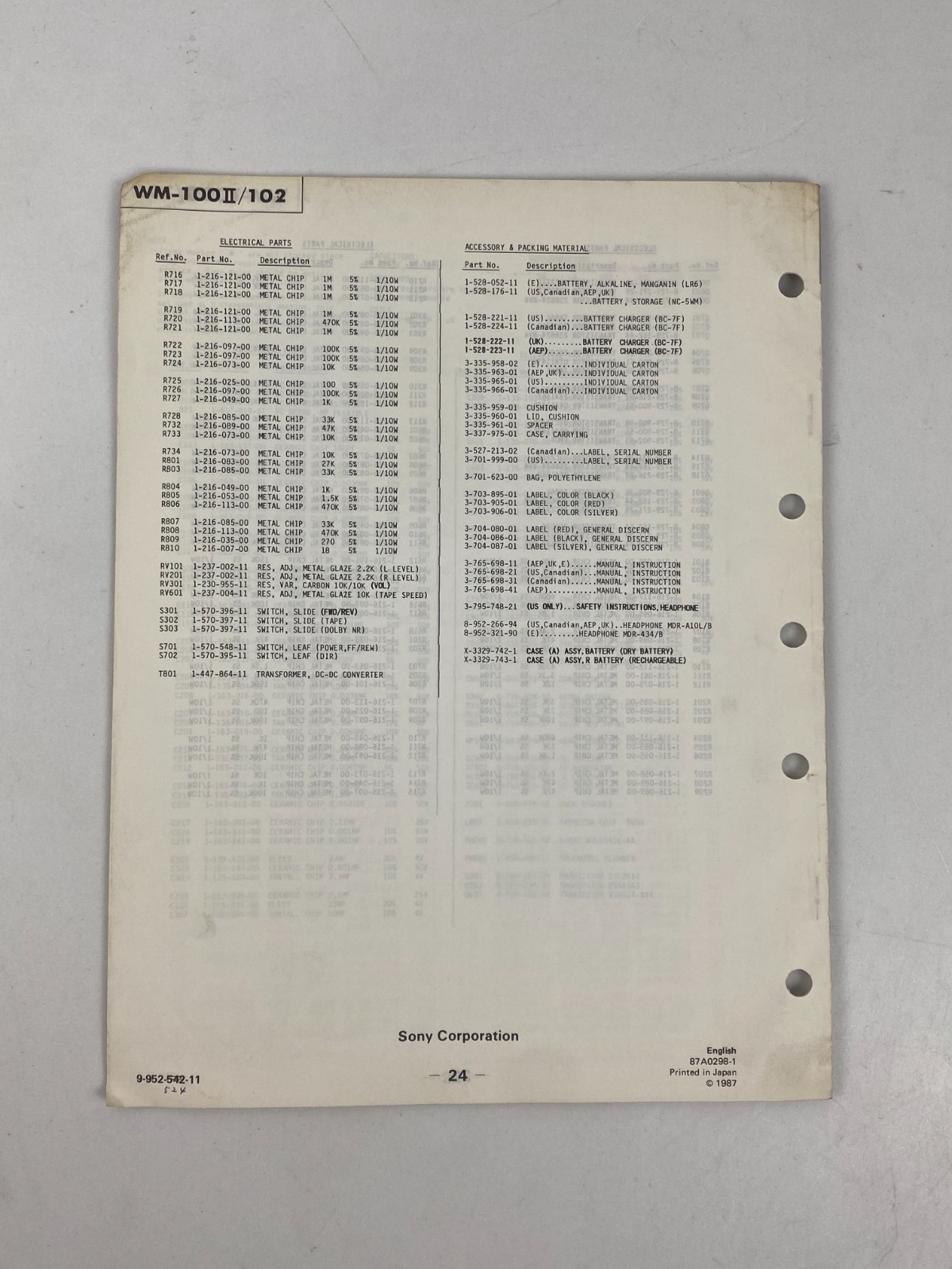 Vintage Sony WM-100II/102 Walkman Cassette Service Manual Original