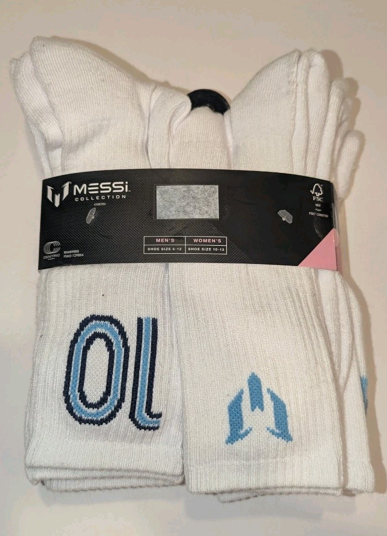 Messi Collection 6 Pair Cushioned White Crew Socks Men Shoe 6-12 Women 10-13 NEW
