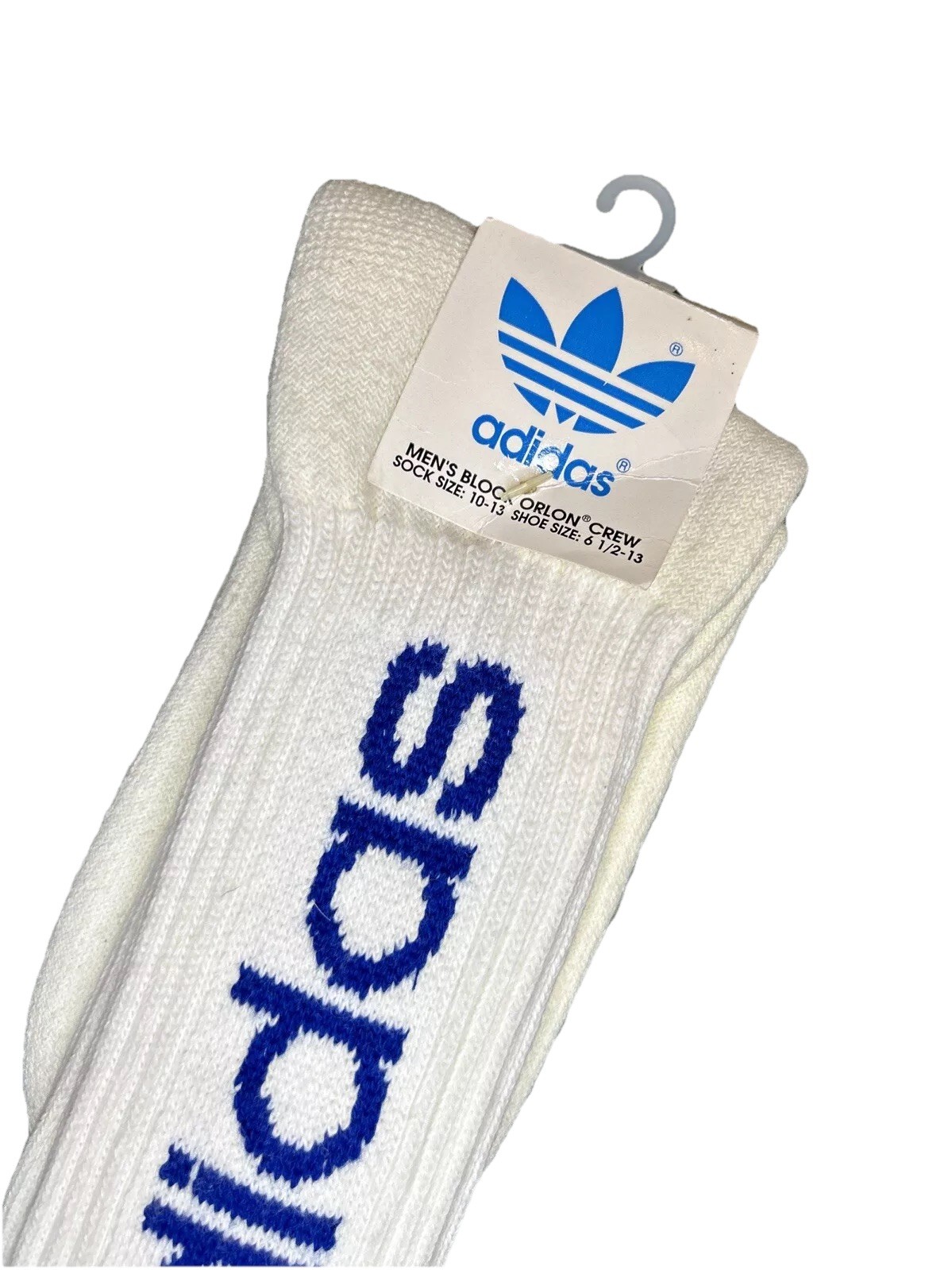 VTG Adidas Crew Socks White/Royal 10-13 Spell Out Acrylic Blend Men's 1980's NOS
