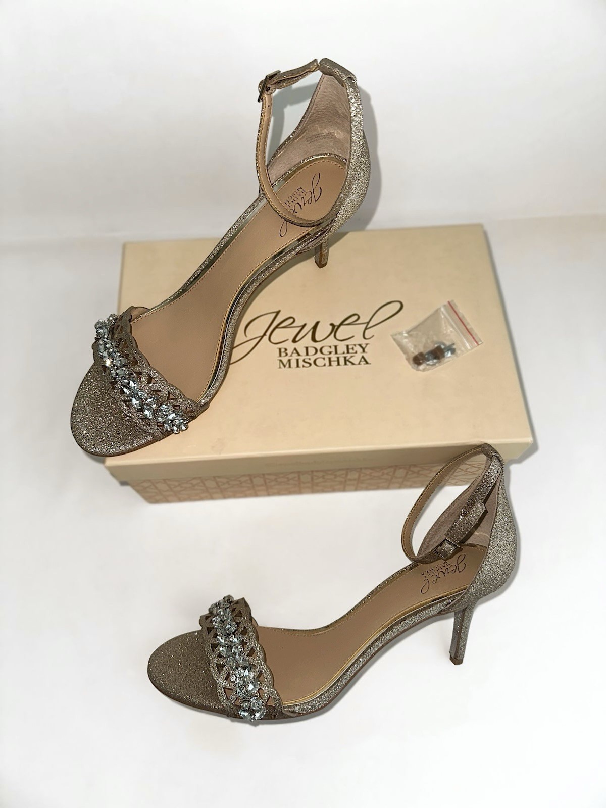 как выглядит JEWEL By Badgley Mischka Kirsten Embellished Laser Cut Glitter Sandals Gold 11M фото