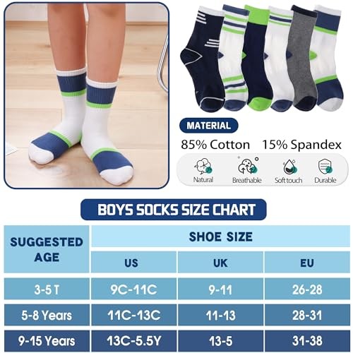 6 Pairs Kids Boys Girls Socks Athletic Basketball 5-8 Years Splice/Green/White