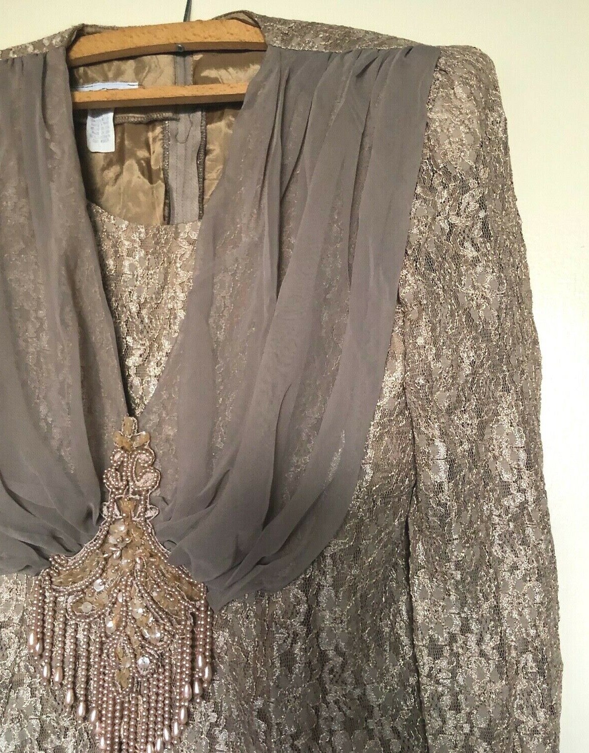 Vtg 80s 90s Drape FLORAL Applique LACE Shoulder SEQUIN PEARL TROPHY BLOUSE Top L