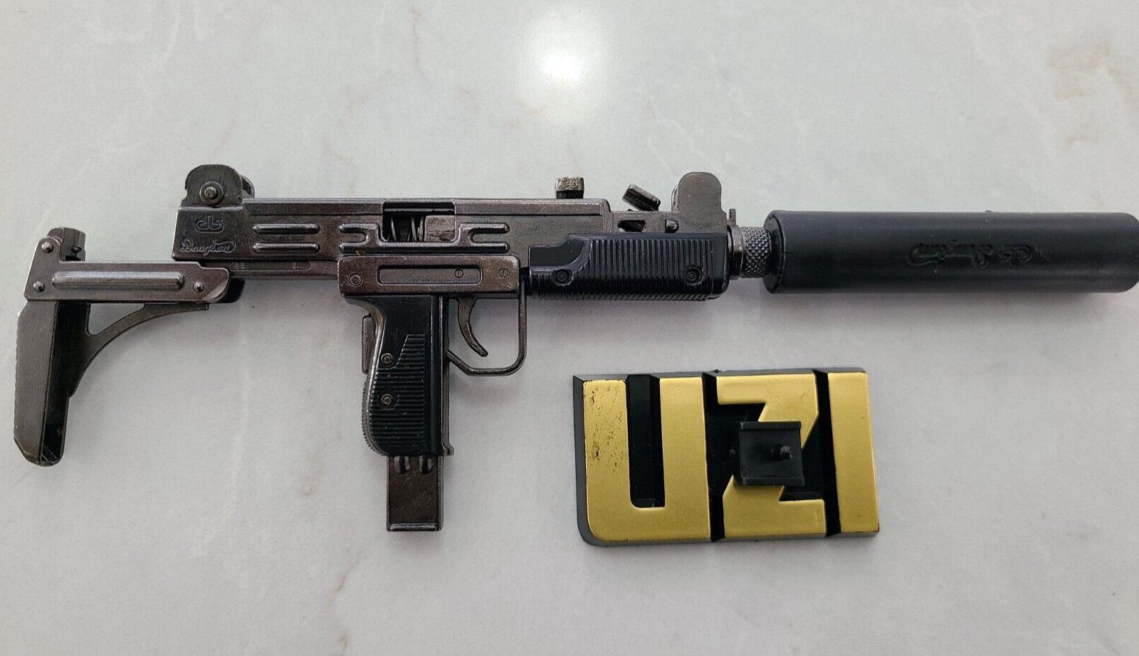 Extremely Rare Israeli UZI 1/5 Scale Diecast Cap Gun Desk Model with Stand