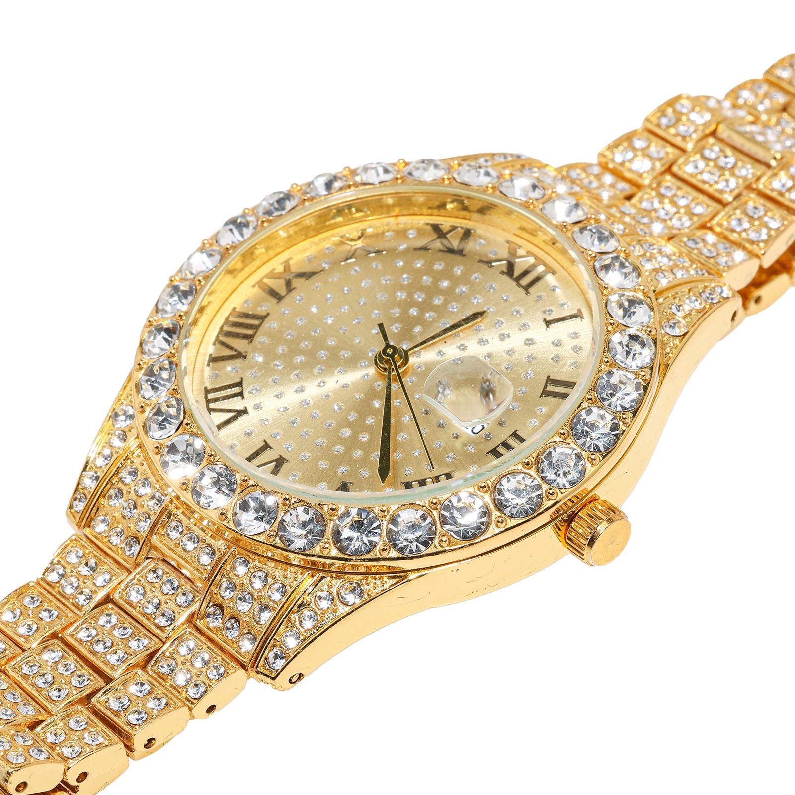 как выглядит Mens Gold Watch Diamond Iced Out Luxury 42MM Round Quartz Wristband in Gift Box фото