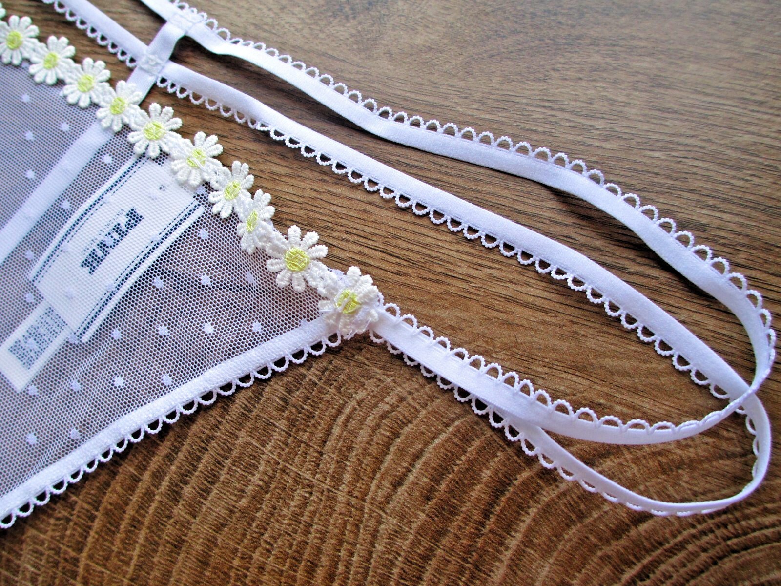 Accents: Embroidered, Strap, Picot Trim, Embroidered Daisy Accents, Strappy Waist, Dot Mesh Details