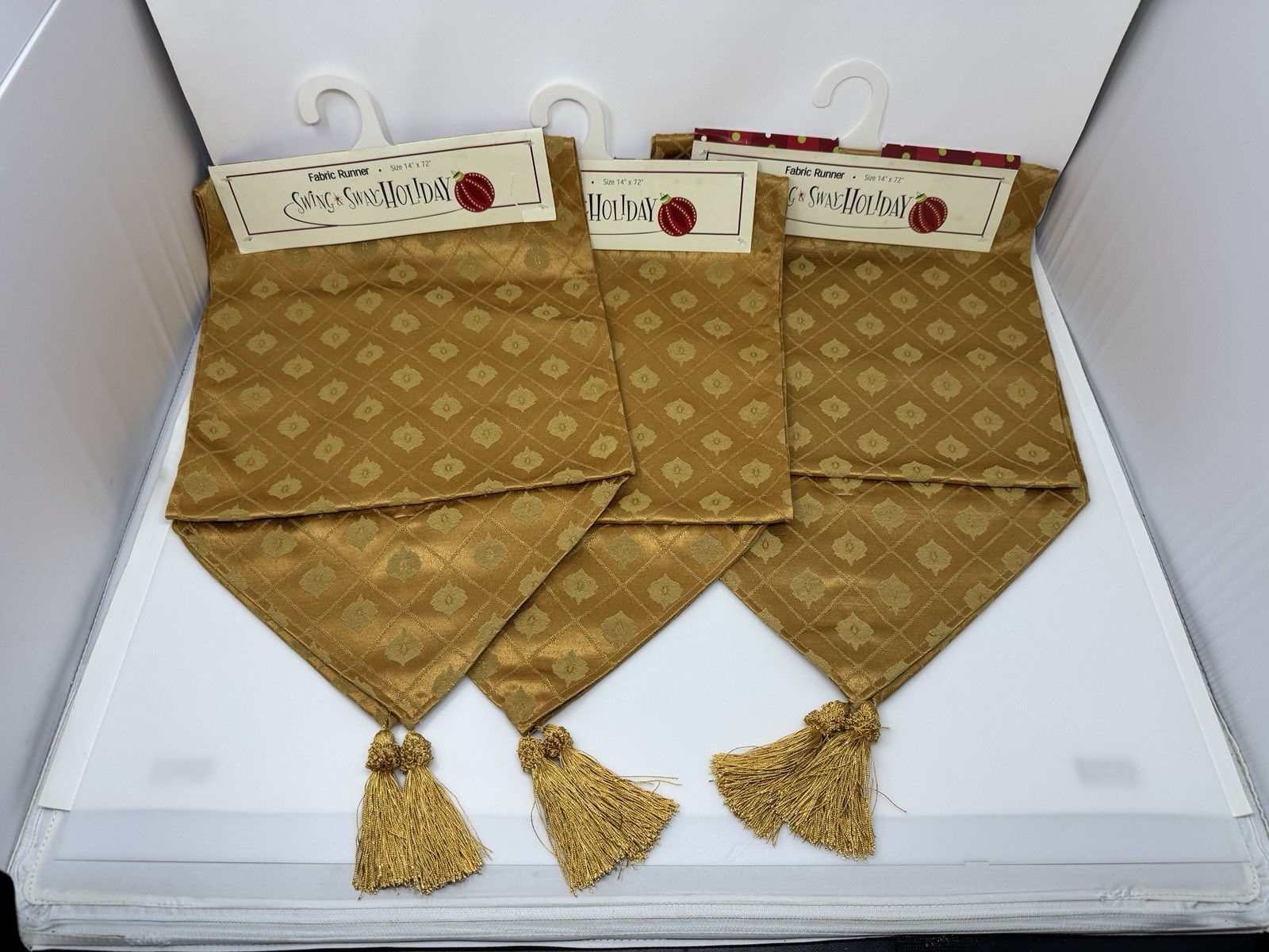 Christmas Fabric Table Runner Gold w/ Diamond Pattern Ornament Design 14 x72