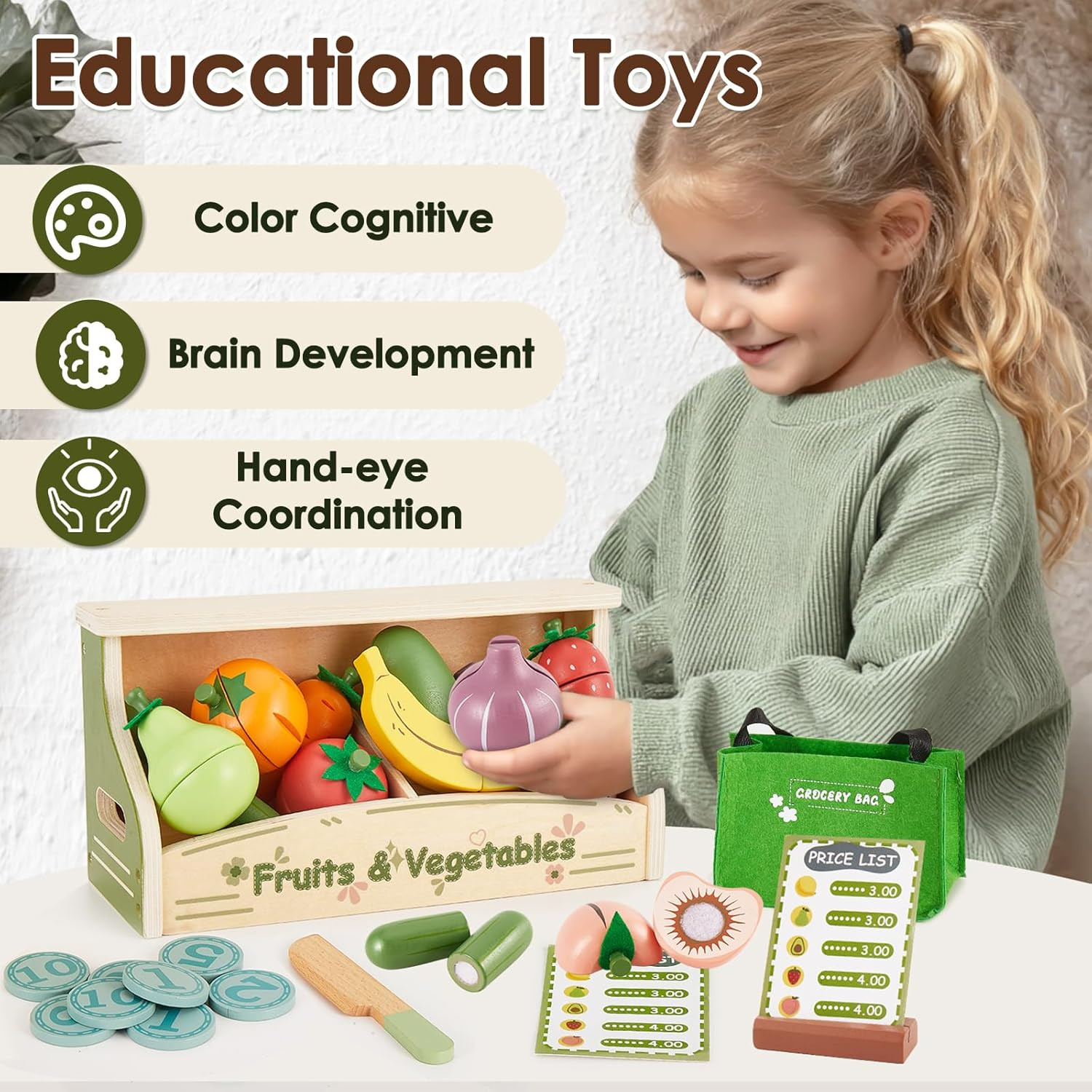 BUYGER Pretend Play Food Sets for Kids Kitchen, Wooden Cutting Toy Food Counter
