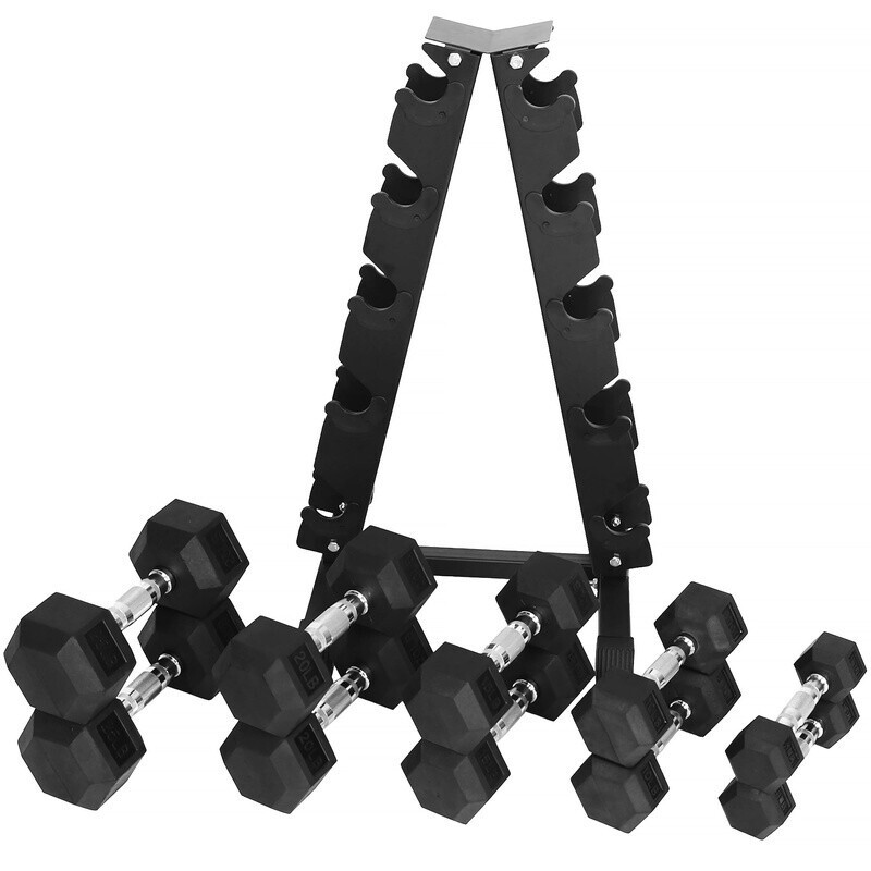 Rubber Coated Hex Dumbbell Weight Set 150LB with A-Frame Rack Strength Training