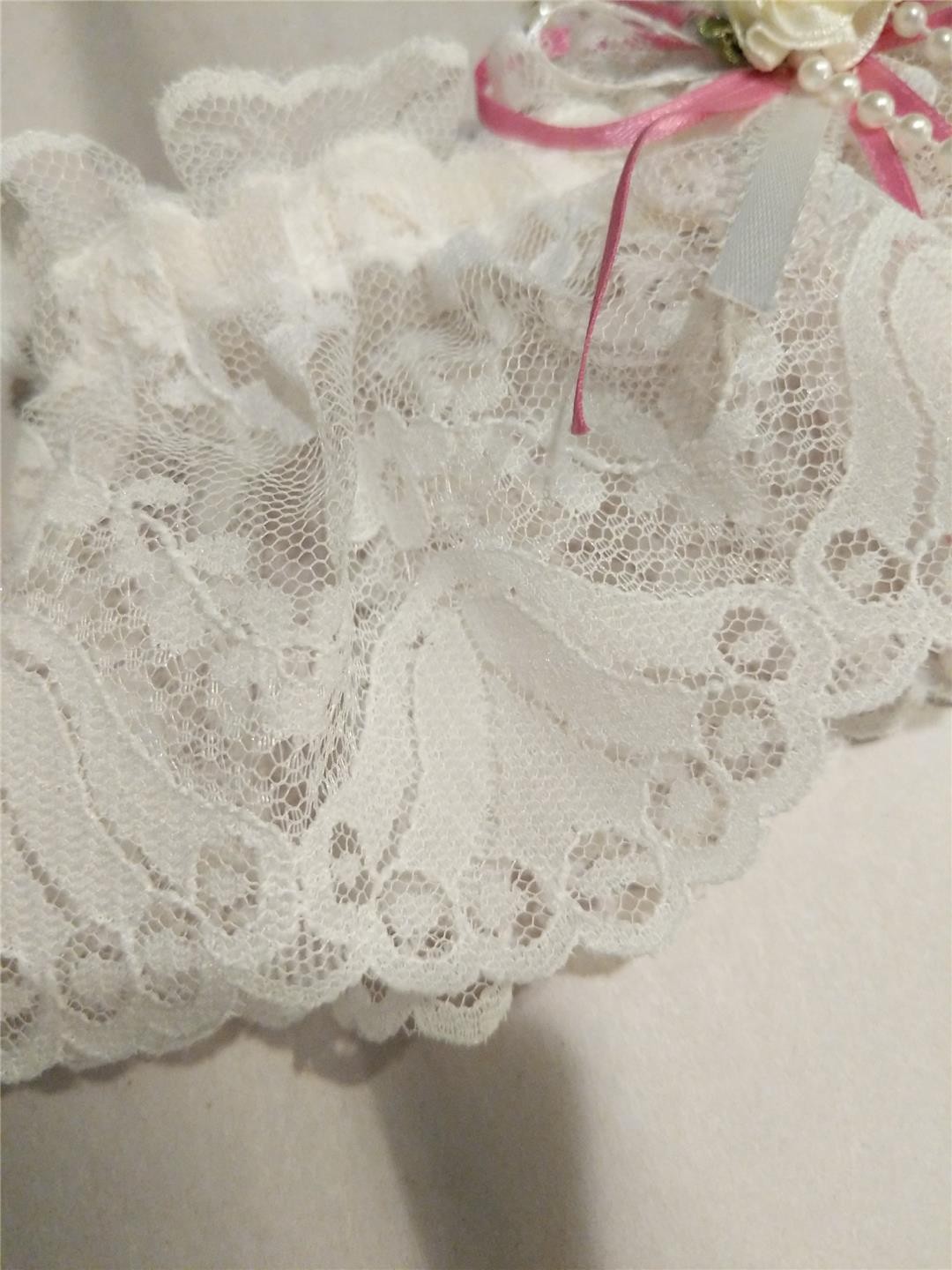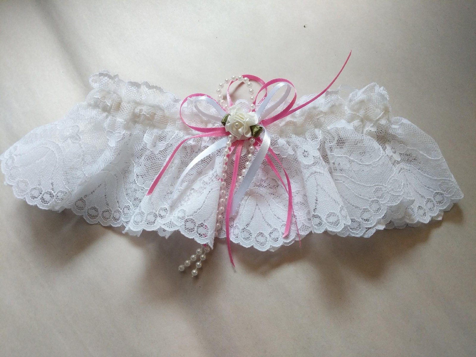 как выглядит Custom Bridal Wedding Garter Handmade White Lace Pink Ribbon Bride фото