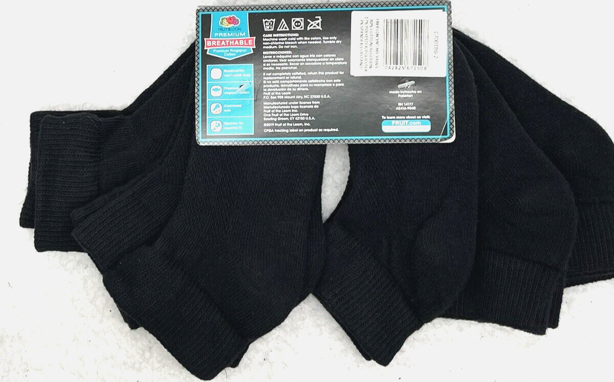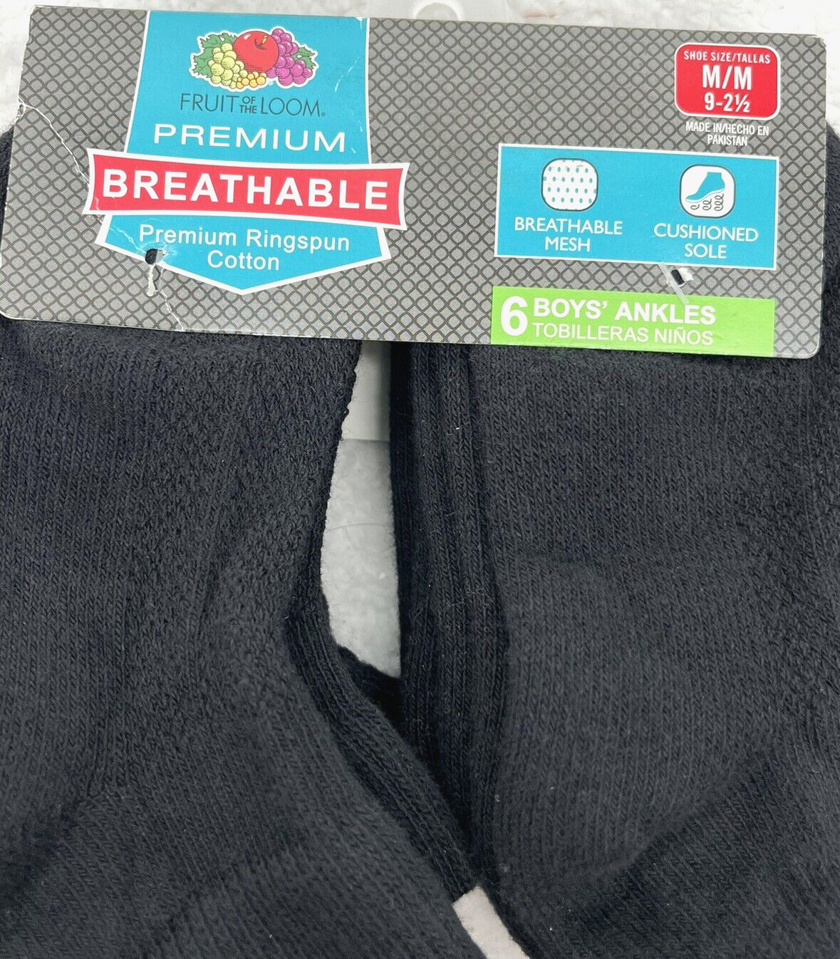 Fruit of the Loom Boys' Ankle Socks Sz Medium 9C-2.5Y Black 6-Pk Premium Cotton