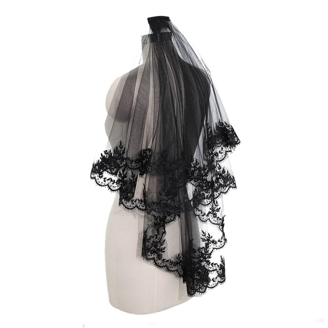 Wedding Lace Black Veil Long Floral Veils Halloween Brides Soft Tulle Bridal ...