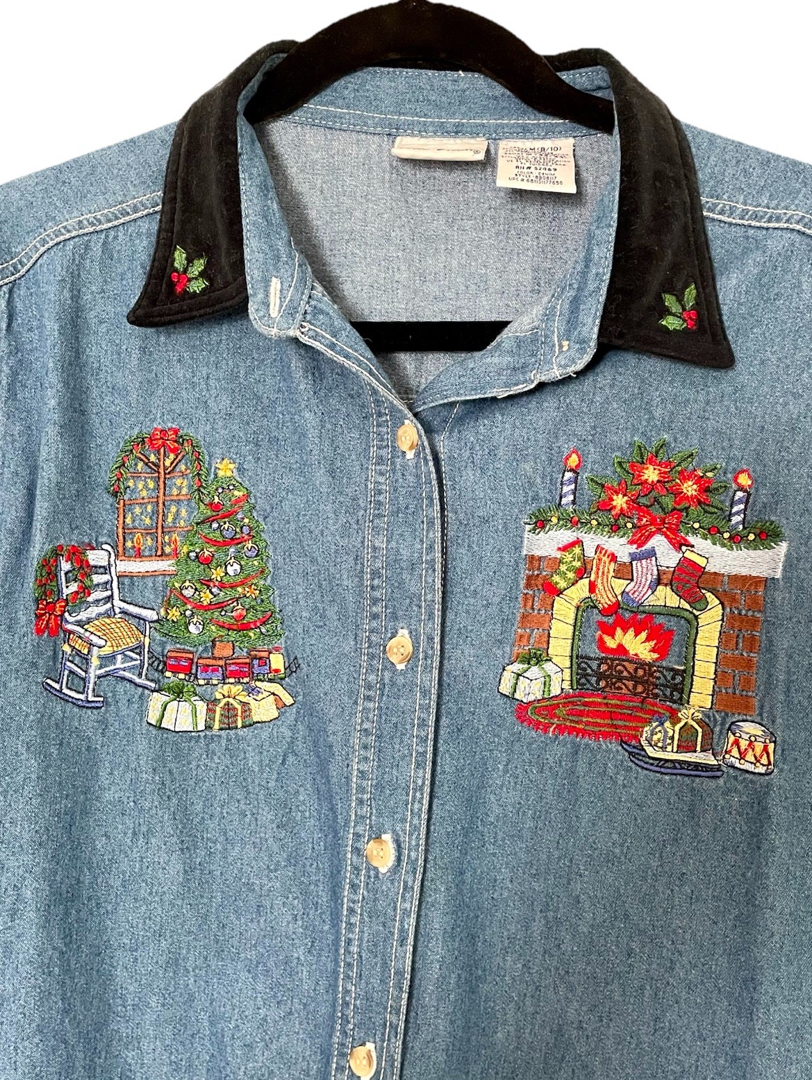Bobbie Brooks Christmas Embroidered Denim Shirt Velvet Collar Vintage Med