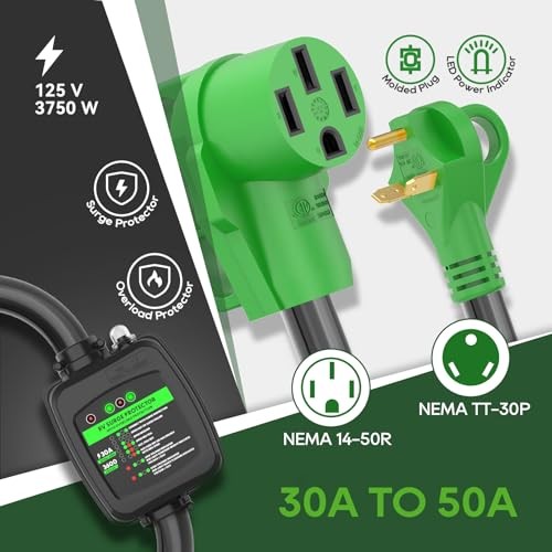 Surge Protector 30 Amp to 50 Amp RV Adapter Cord with Overload 30M/50F