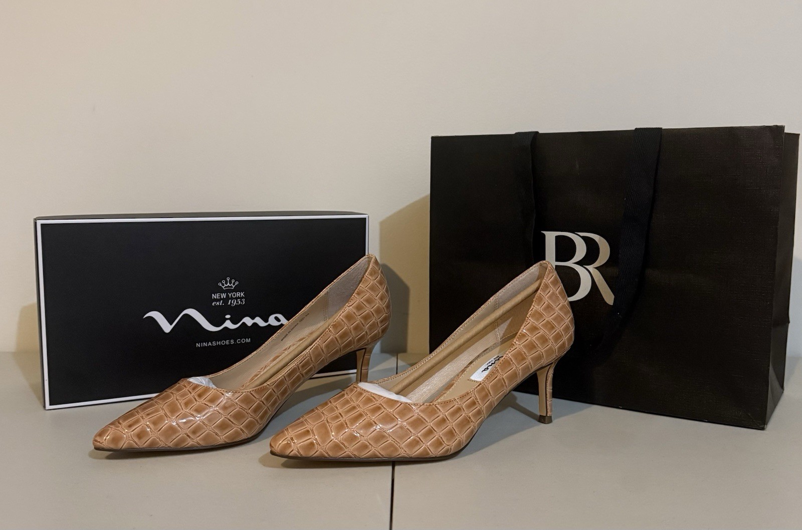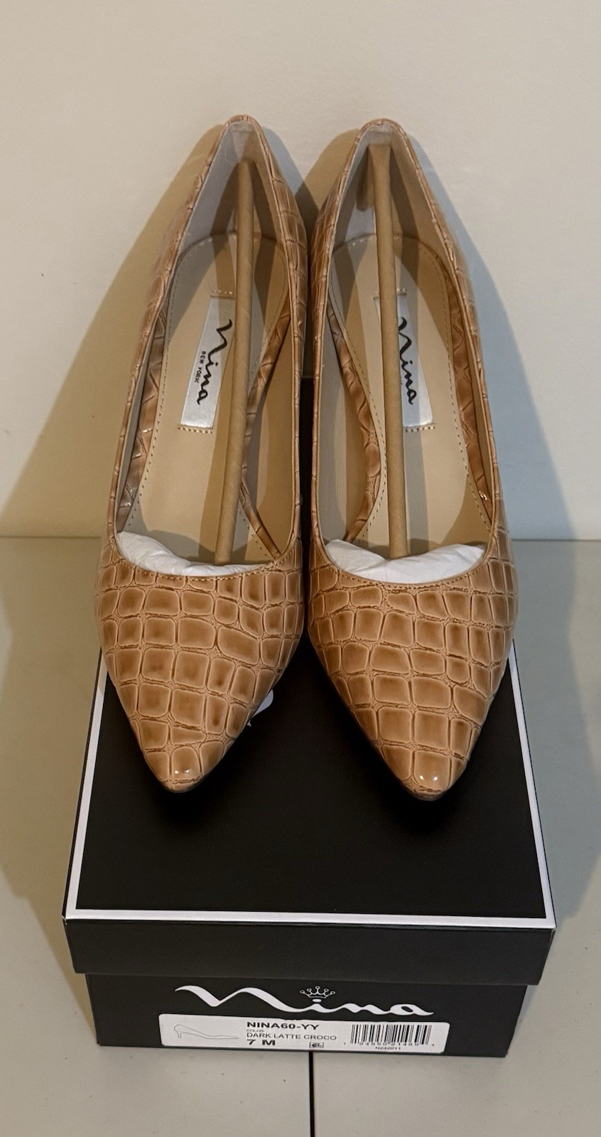 как выглядит NINA60 DARK LATTE CROCO PATENT LEATHERETTE MID-HEEL CLASSIC PUMP SIZE 7M фото