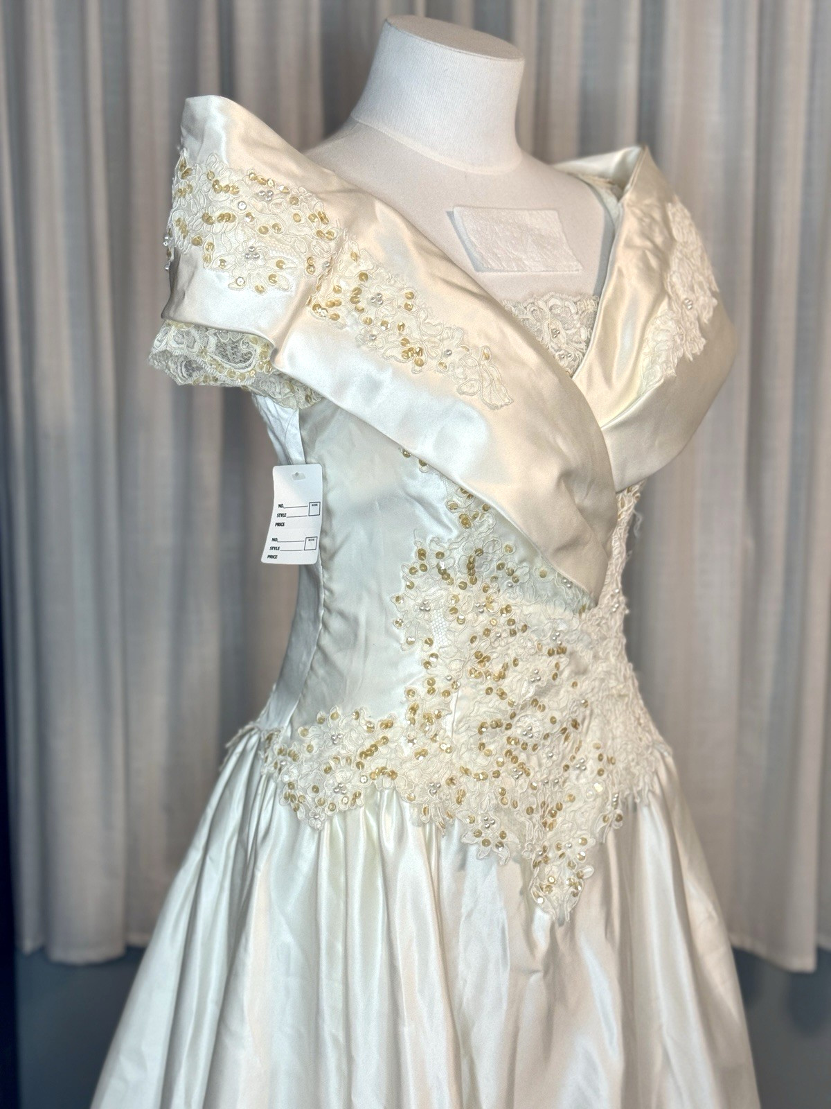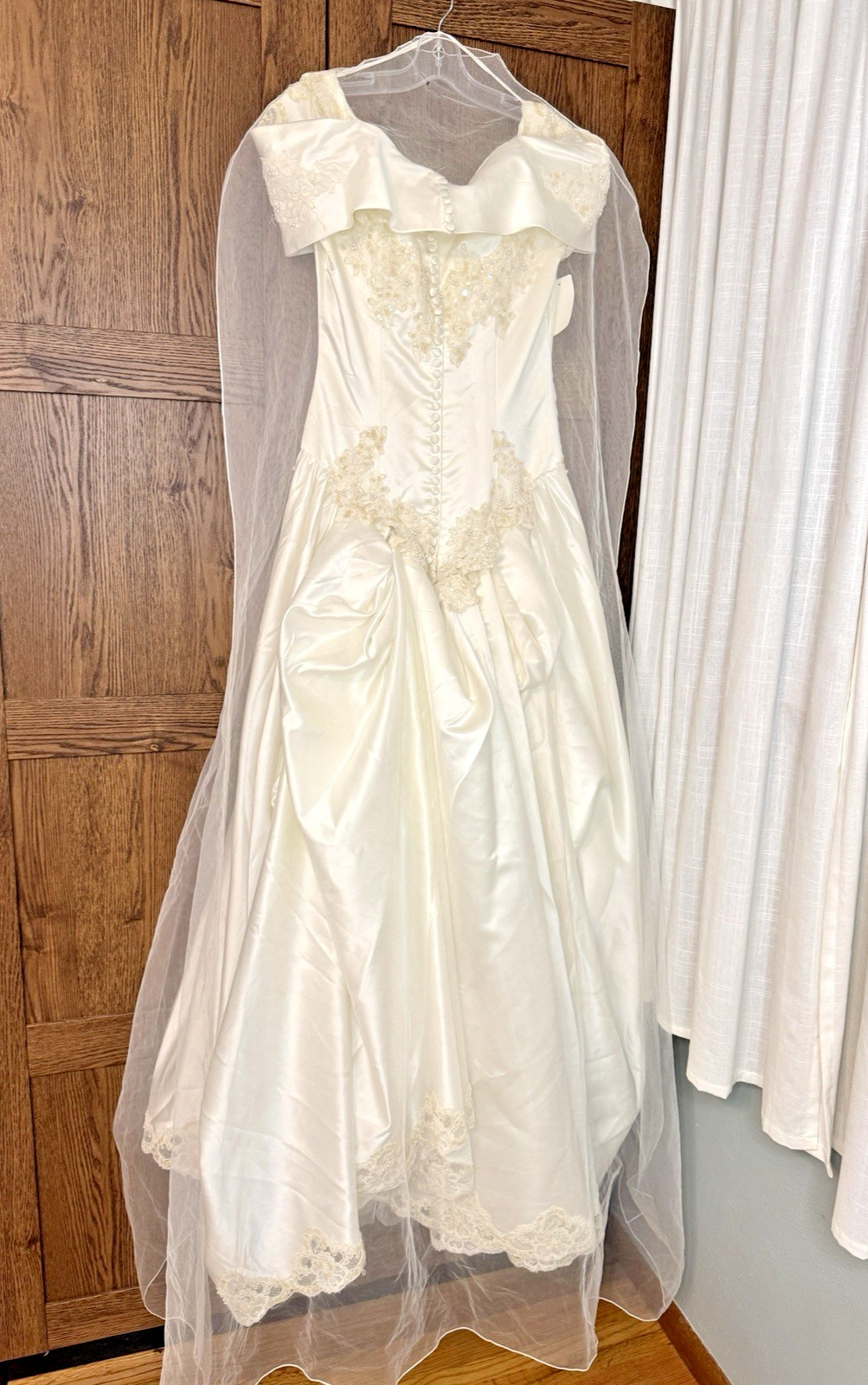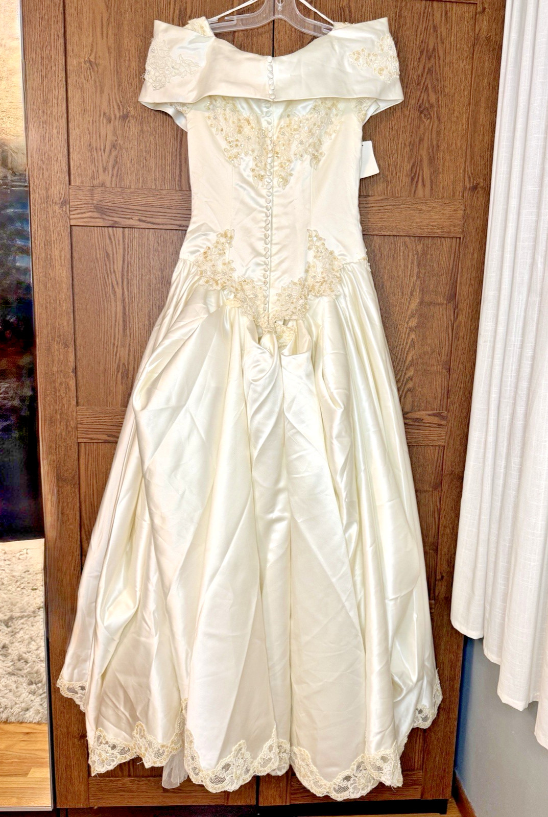 как выглядит Vintage Alfred Angelo Off Shoulder Satin Wedding Dress Lace Train  Needs Repair фото