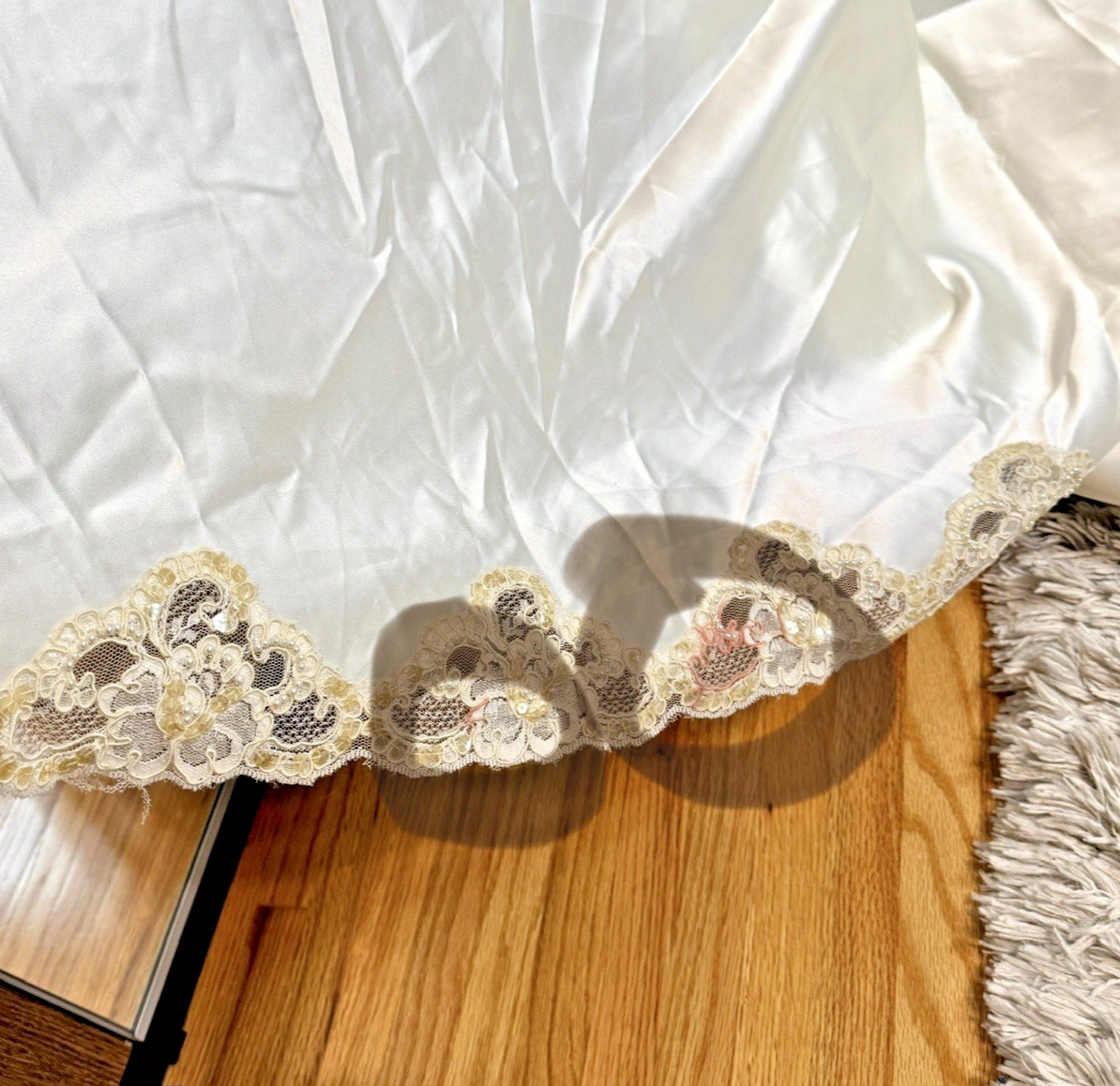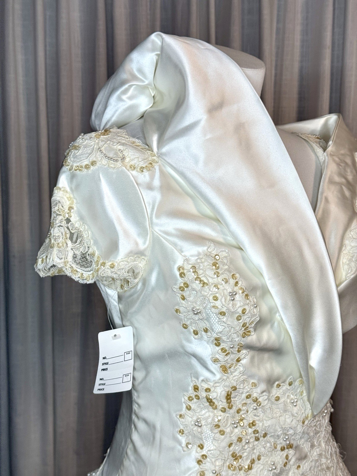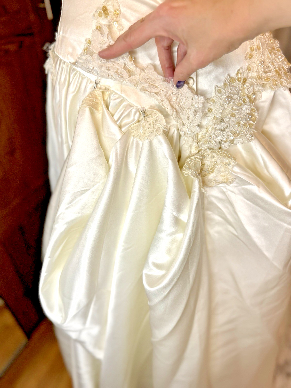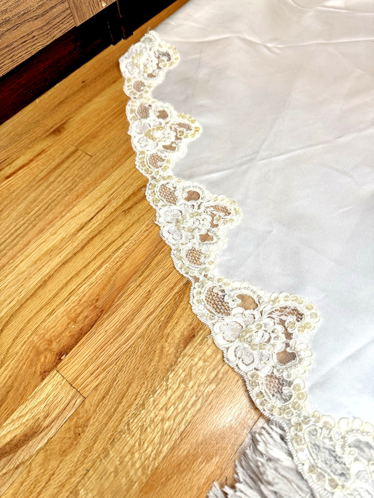 как выглядит Vintage Alfred Angelo Off Shoulder Satin Wedding Dress Lace Train  Needs Repair фото