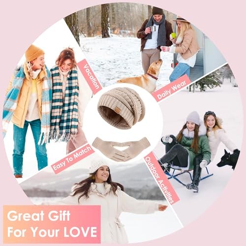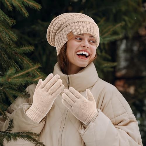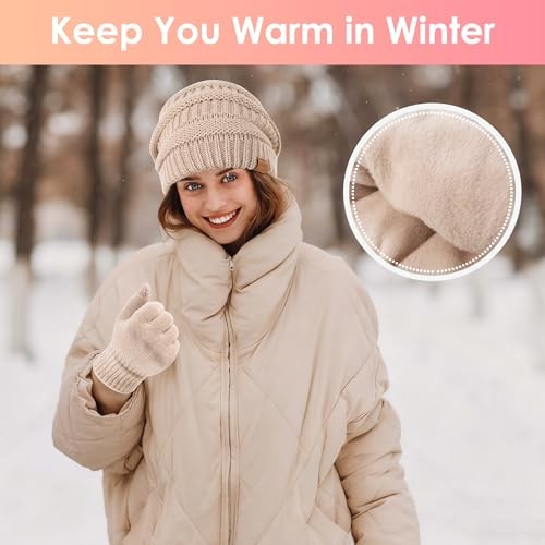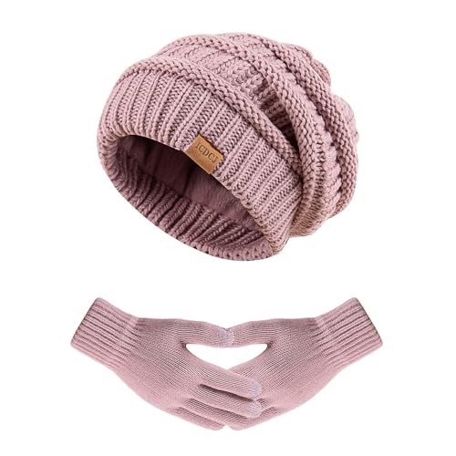Women's Beanie Hat Gloves Set, Fleece Lined Winter Hat with Touchscreen Pink